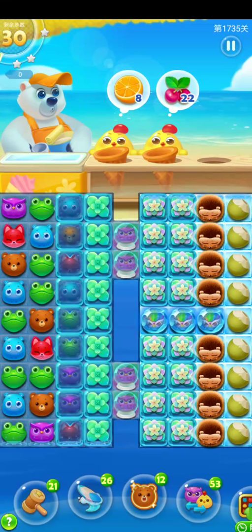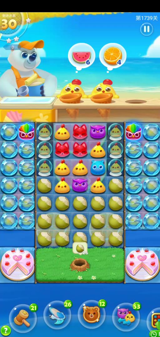 关卡元素:圆冰块,蜂蜜块,冰淇淋盒,胡萝卜,椰子。打掉第一根胡萝卜算是开局,这根萝卜不是每次都能打到,除非运气特别好,所以兼顾椰子和蜂蜜块一起打。开局后,我们在右侧得到了四列的操作空间,如果在中上部有横线的特效,尽量组上,这对清理左上角的冰淇淋盒有好处。另外特别要说一下圆冰块里的三只魔力鸟,如果分着与其他特效组合,只要你注意控制组合特效的覆盖范围,那这样的效果要远大于一次魔力鸟双飞。当然如何选择