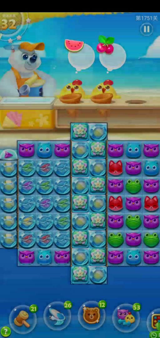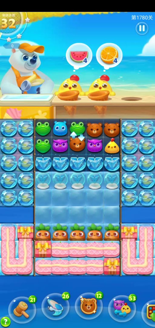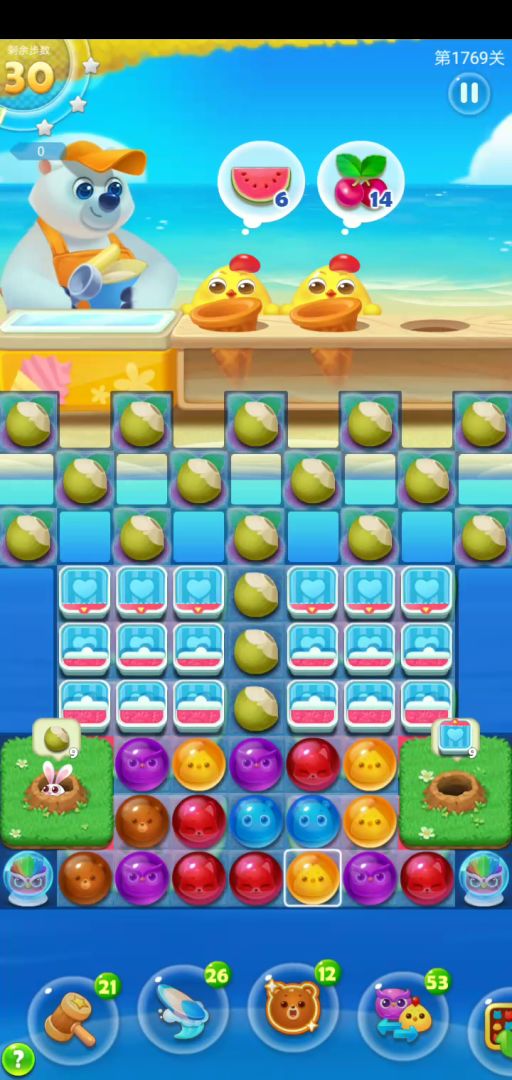 关卡元素:兔子宝宝,冰淇淋盒,椰子,万能水晶,其他忽略。前期先打开兔子,这个过程别急,慢慢来,冰淇淋有方向的。兔子开了以后要充分利用万能水晶,灵活的使用魔力鸟,或单飞或组合或留。这里处理的方式和海岛鸟类道具一样,如何调整如何使用,根据具体局势走。如果你不擅长这样的关卡,建议你采用双前置来简化关卡。