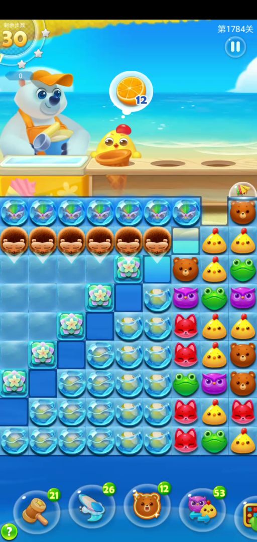 关卡元素:椰子,刺猬,圆冰块,厚冰块,纸飞机。这关要充分利用纸飞机,前期用他来打开局面使刺猬移动,让小动物滑动起来补添空位。中后期左上部分没机会的时候利用纸飞机刷新一下。圆冰里的鸟前期单个用掉就好,作为调整用。如果你总想打出鸟配其他特效的组合,其实是不划算的,任务区域空位太多,特效组合的效率太低,没那么大的覆盖面。中后期再想法子利用剩余的鸟。总之这关于其他关比不是太难,开局加三步就可以了,仔细些