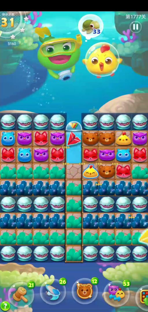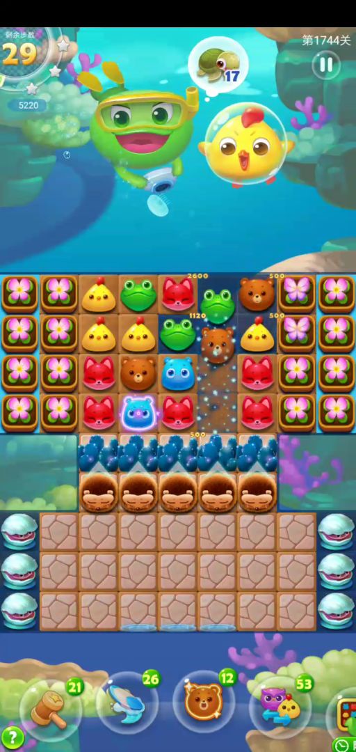 关卡元素:除了潜水拍照关固有的元素,还有刺猬和蝴蝶花。一共两页,第一页下边由于刺猬的阻挡存在了大局域的空位,所以在这些空位没有被填充之前,触发蝴蝶花一定小心点,不要一次触发过多。做到这点第一页会很快通过。第二页本宝宝没有太好的思路,只能利用第一页的步数优势,一点点的磨。如果有好办法的小伙伴可以留言给我。建议前置三步。