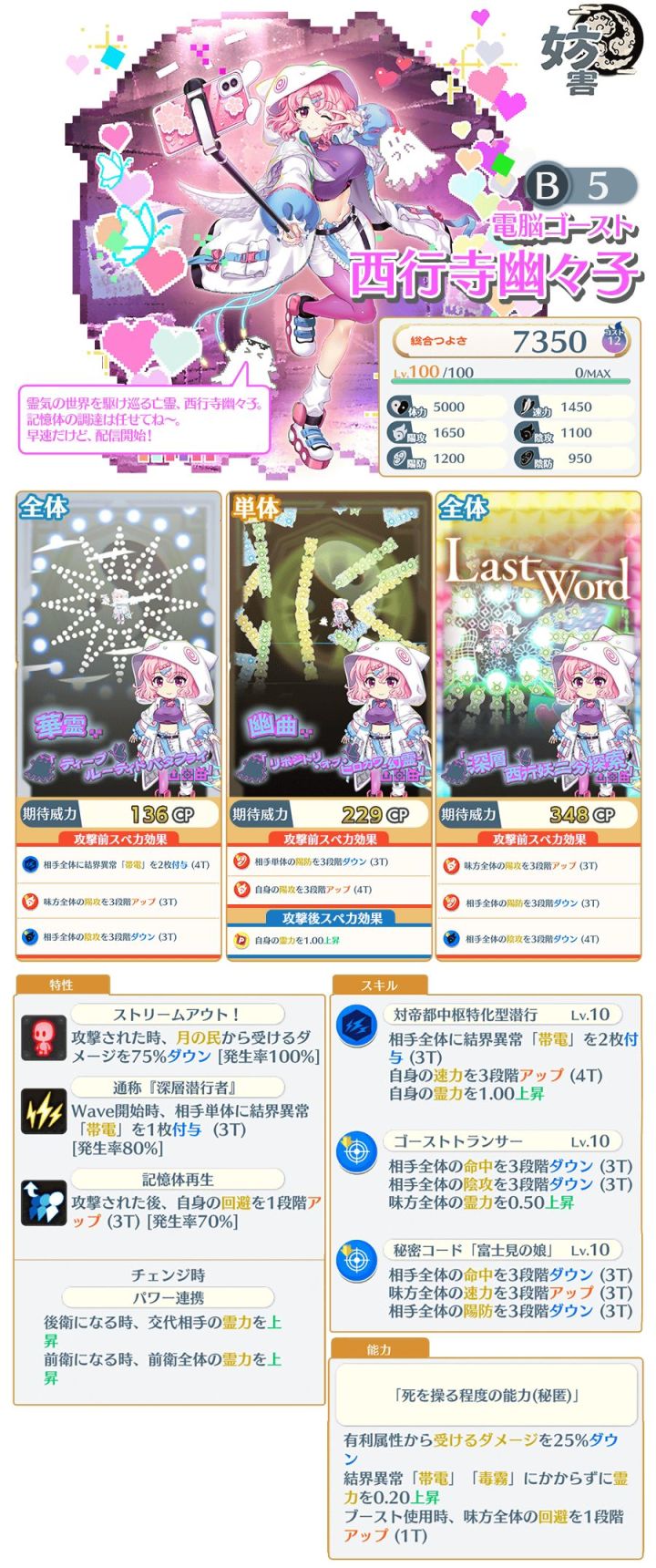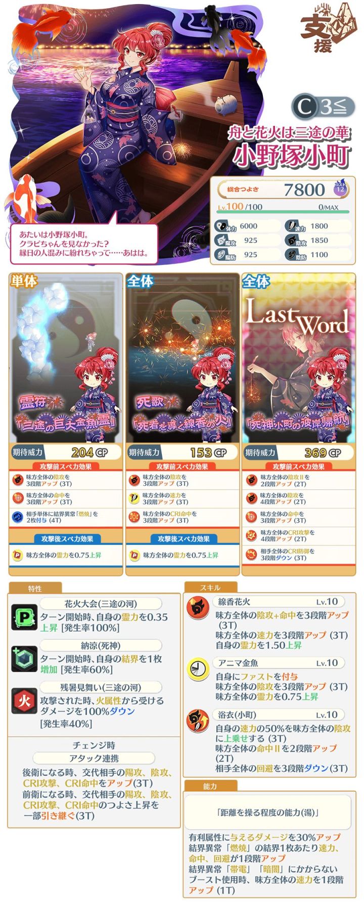 摆了一周,所以一下来四个,和服小町支援式贵限C3≦世界线结尾辞「≦」指「残暑之时的气质变化」打阴,1850阴攻 1800速力,技能积蓄为速度的50%强化全体阴攻(3T),和樱赫卡同款的积蓄技,基础拐挺足的,II阶buff是全体命中II,基本是用不上的,除非是5暗的场合...有利增伤30%,结界激昂是速度,开p给全体速度,免电暗,单体小卡:特攻:夏、浴衣、水栖、灵魂、三途河、