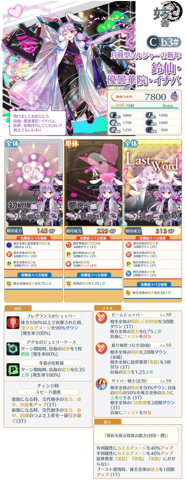 元旦快乐!今年的官方贺图:今年的过年皮肤:辉夜和永琳好了,正片开始,新春月战妖梦破坏式贵限Cb3#世界线打阳,2000攻击和1800速力,相当恐怖兄弟,四单一全,颇有当年水红梦的感觉,技能II阶buff是全体会心攻击II3段(2T),非常强力的II阶buff,再加上不俗的基础拐,只可惜拐没有拆分,大头被扔在了同一个技能里,遇到强解环境容易卡buff,但是,开p和开盾的全体