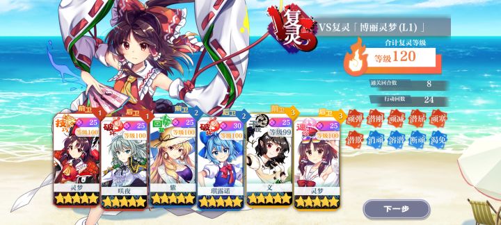 C位:月灵梦(转生)、猎咲(转生)、水紫、⑨(二转)第一管血:前排小卡一回合破盾(留1、2个盾也行),[花]文放终符(换其他没被ban的多日/水终符的角色也行,我这个文甚至没装任何绘卷),剩下俩人单体符卡补伤害。第二管血:水紫双解锁,不换人,两回合预热(至少破掉3日盾和1水盾),然后月灵梦和水紫上终符。第三管血:三人全换,一回合预热后三个终符开炸!水灵梦伤害不高,感觉换废区四季或其他降防的都