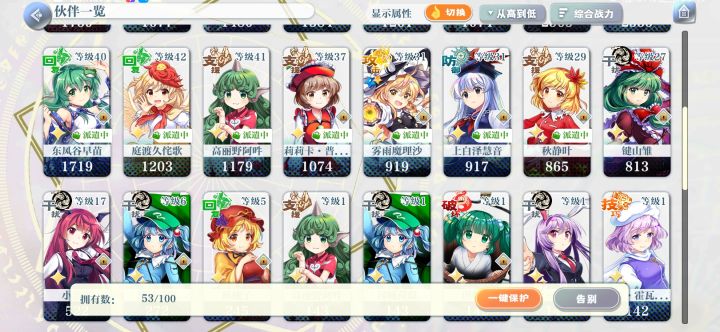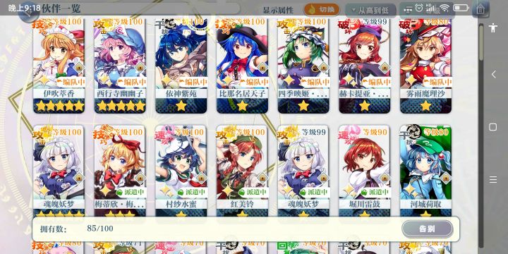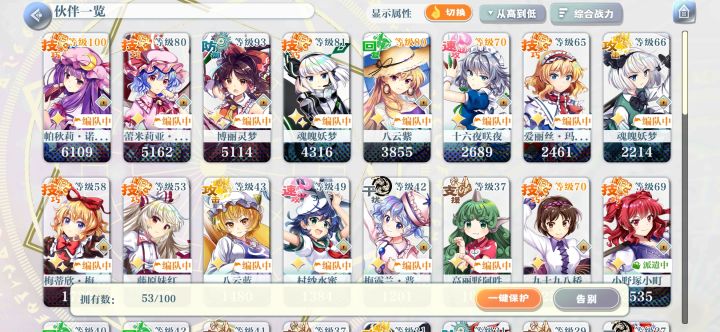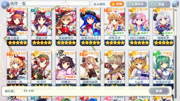 更新了新人角色培养的建议,不知道养谁的可以参考一下首先说明一下,这个游戏本质上是培养角色的单机厨力抽卡游戏,只要有爱没什么角色是不能用的(只是有些角色可能会用着不太顺手而已),大部分情况下角色强度都是溢出的,本建议只是为了那些不清楚这游戏怎么玩的新人一个初步的指引先晒下个人目前的主力队伍,总共10个满破c,雷鼓因为木c有幽幽子了不着急满破打算等歪,灵梦因为一直没歪到就没满破,红魔塔70层一次全