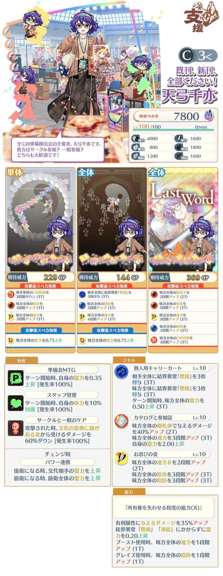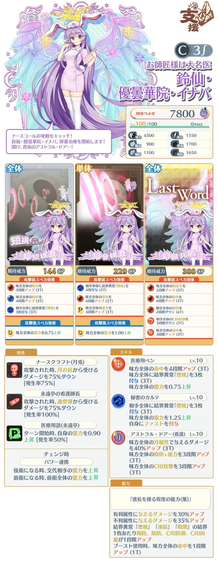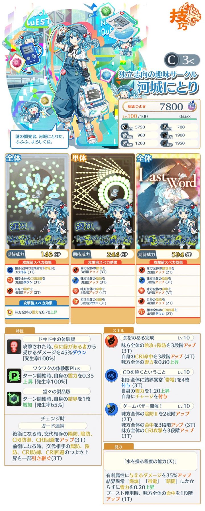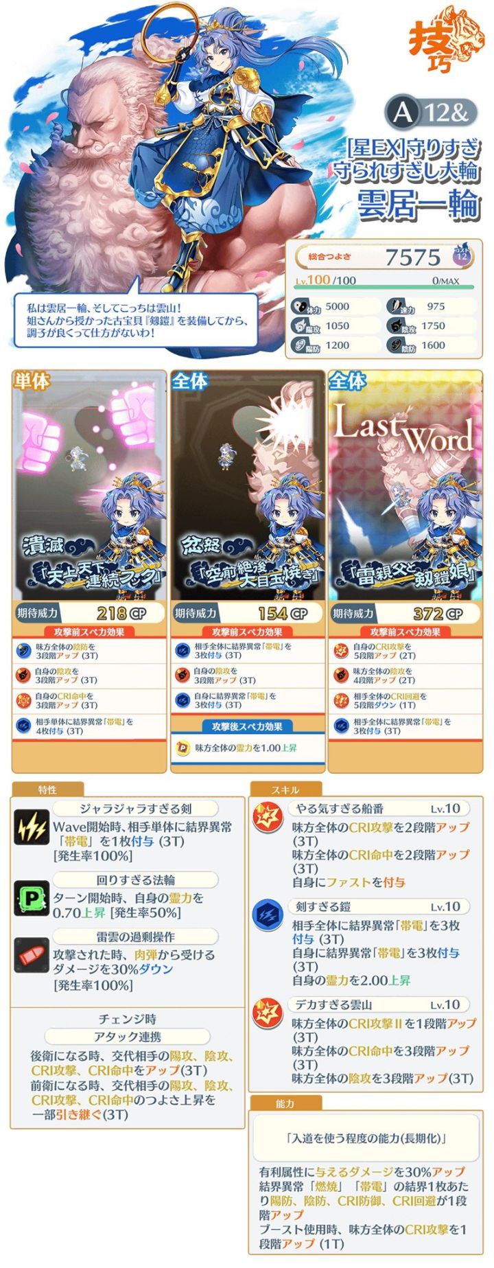 [星EX]一轮技巧式EX线A12&世界线975速...1600阴防1750阴攻阴攻算是偏低了技能全体会心攻击和会心命中,全体会心攻击II1段3T全体拐算是还行水平,有利增伤30%,单体小卡:特攻:主人、灵魂、神格、人类、宗教家、魔法使、灵魂、魔人、神灵殿、格斗家、僧侣、超人、命莲寺,硬质:50%*2+60%,单体4电2p破盾,其他也没啥,全体小卡:特攻同上,硬质:60