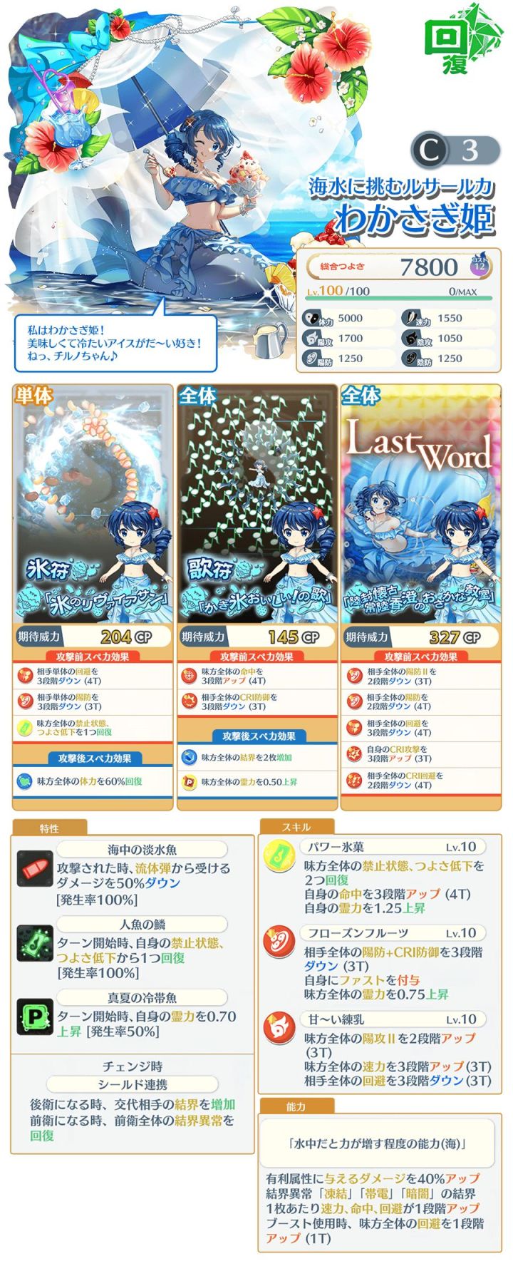 泳装若鹭姬回复式贵限C3世界线面板 1550速力 1700阳攻,考虑到补正,比较低的面板了,技能,你确定你不是干扰式和支援式?全体双解锁,降阳防和会心防御,全体阳攻II2段(3T),有利增伤40%,免冰点,结界激昂是速度,buff给了一堆降防,就导致完全没有基础阳攻,基础的速度buff也就3段,会心攻击也只在lw有3段,单体小卡:特攻:死神、像、吸血鬼、夏、泳装、水栖,这