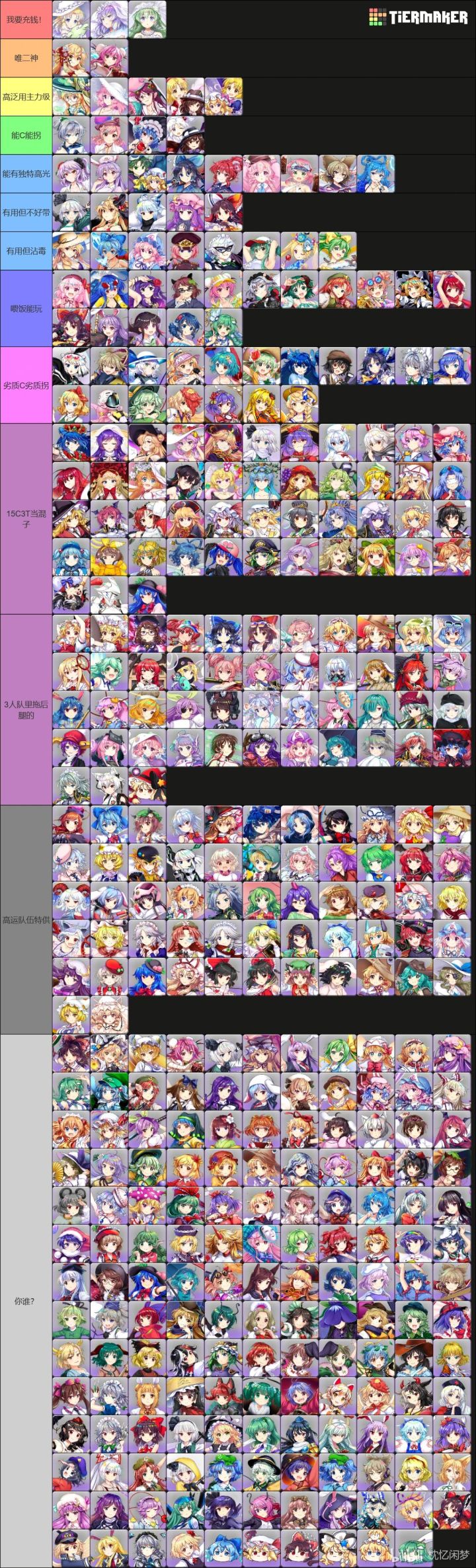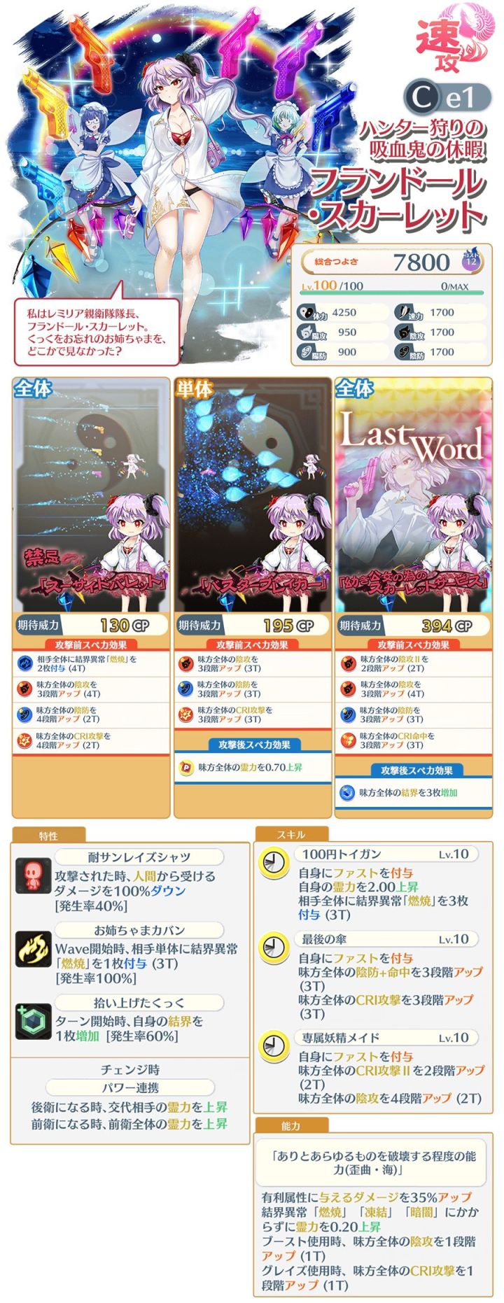 和泳装夜雀一对破坏式贵限C3世界线打阴,面板1950 阴攻,1650 速力,技能是全体会心攻击II2段(2T),剩下的常规buff,技能给的不算特别爆炸,但是lw稍微补足了很多 ,有利增伤40%,算是比较多的了,没有结界激昂,免冰电,开盾给会心命中,单体小卡:特攻:16段:3段:兽、妖怪之山、太阳花田、神灵殿、音乐家,5段:妖精、人类、兽、妖怪之山、太阳花田、神灵殿、音乐家,