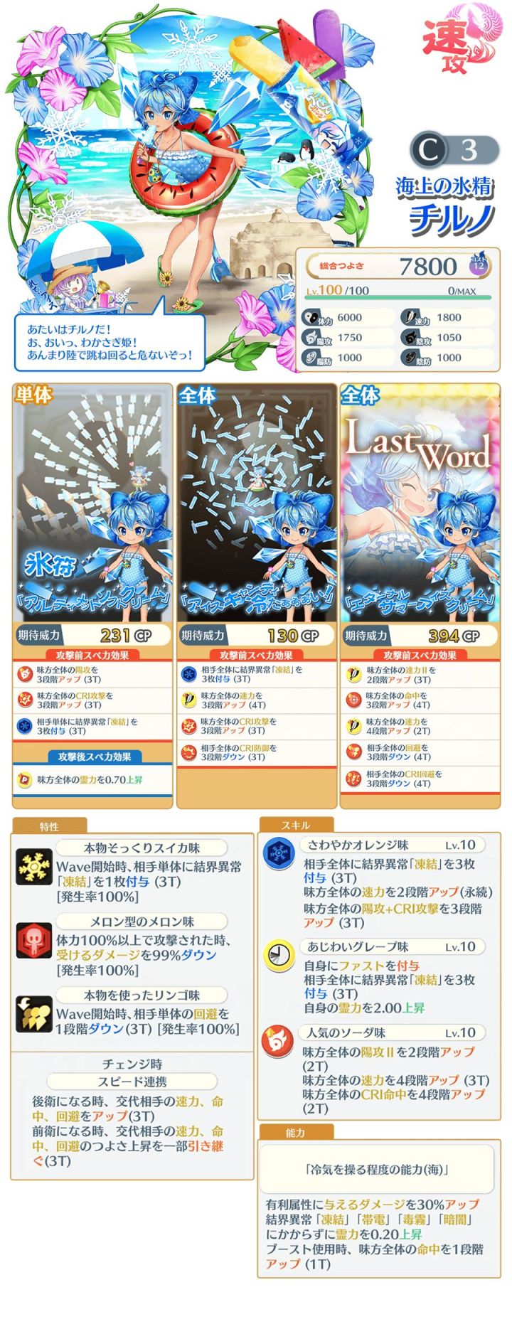 泳装⑨速攻式贵限琪露诺酱晒黑了2333面板 1750阳攻 1800速力,感觉最近出了很多基础攻击不高,全靠副属性加补正的角色,技能,全体2段速度(永续),好了这下I阶buff也有不怕清buff的了,和泳装早苗的永续降防一样,和I阶buff共享一个10层上限但是独立并且不影响I阶buff本身的时间,除此之外的其他基础buff技能给了点但是小卡的很分散,全体阳攻II2段(2T)感觉已经成
