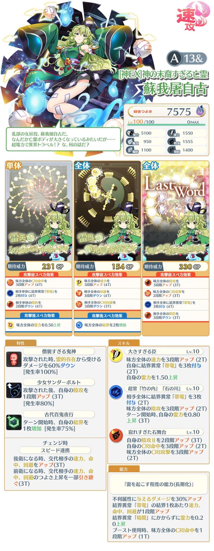 [神EX]屠自古速攻式EX限A13&世界线不是,这面板认真的??史上最低基础阴攻,速力也只给1550,阴防给了1400,但是她没有硬质....技能倒是看上去很正常的,还给了3T的阴攻II2段,甚至还给了不错的全体拐,单体小卡:主特攻:人类、妖怪、妖精,可预见的没输出,全体小卡:特攻:算了3P破电技能给3,lw:主特攻:人类、妖怪、妖精,斩裂:100%、90%、90%、