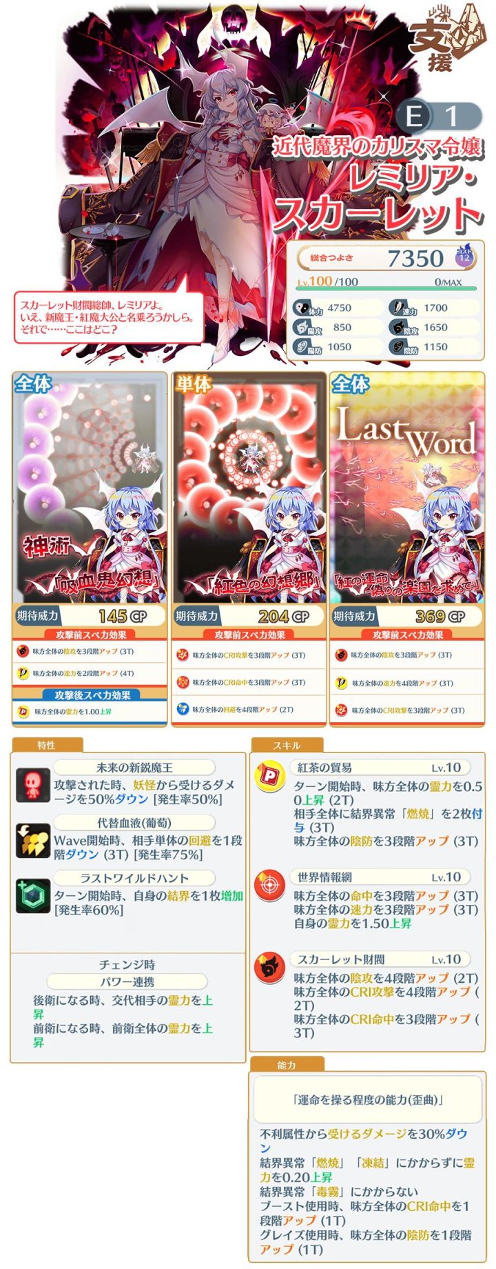 乐园蕾米支援式超限E1和大芙兰同样的世界线阴攻支援式,1700速力??然后是这重量级的全体拐,比某位不知名EX限好了不知道多少,幼神奈子级别的全体拐了,换句话说就是多的有点不太正常,不算绘卷,lw单回合全体7阴攻6阴防7速7会心攻击3命中6会心命中,小卡给的也很多,下一个超限100命预定了,全体小卡:特攻奇奇怪怪,不用指望输出了,3p破火,但是只有技能给异常,需要队友帮忙挂