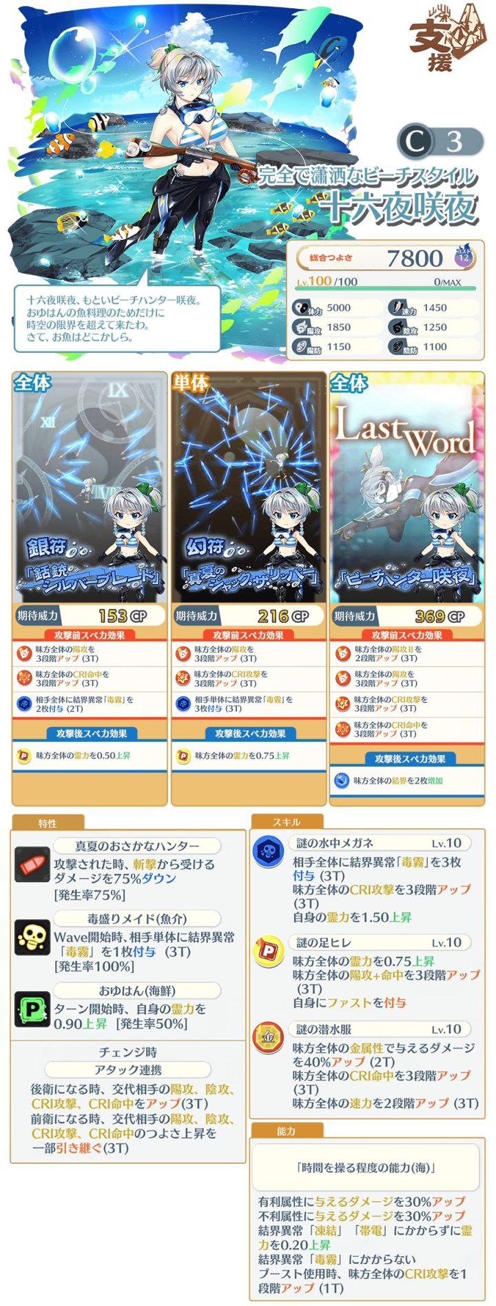 怎么年初七了已经,年过的差不多了终于想起来日服更新了,泳装咲夜,支援式贵限,C3世界线,打阳,面板1850阳攻+1450速力,技能又来+了,有一说一这个口子就这么开了之后是相出11、12词条的技能吗,上一个是新年青灵梦的「と(和)」,这次单纯变成「+」了...技能给的buff相当广泛,阳攻、命中、会心命中、会心攻击全是三段,速力两段金属性增伤40%,给的不少,金属性大c也有人用,