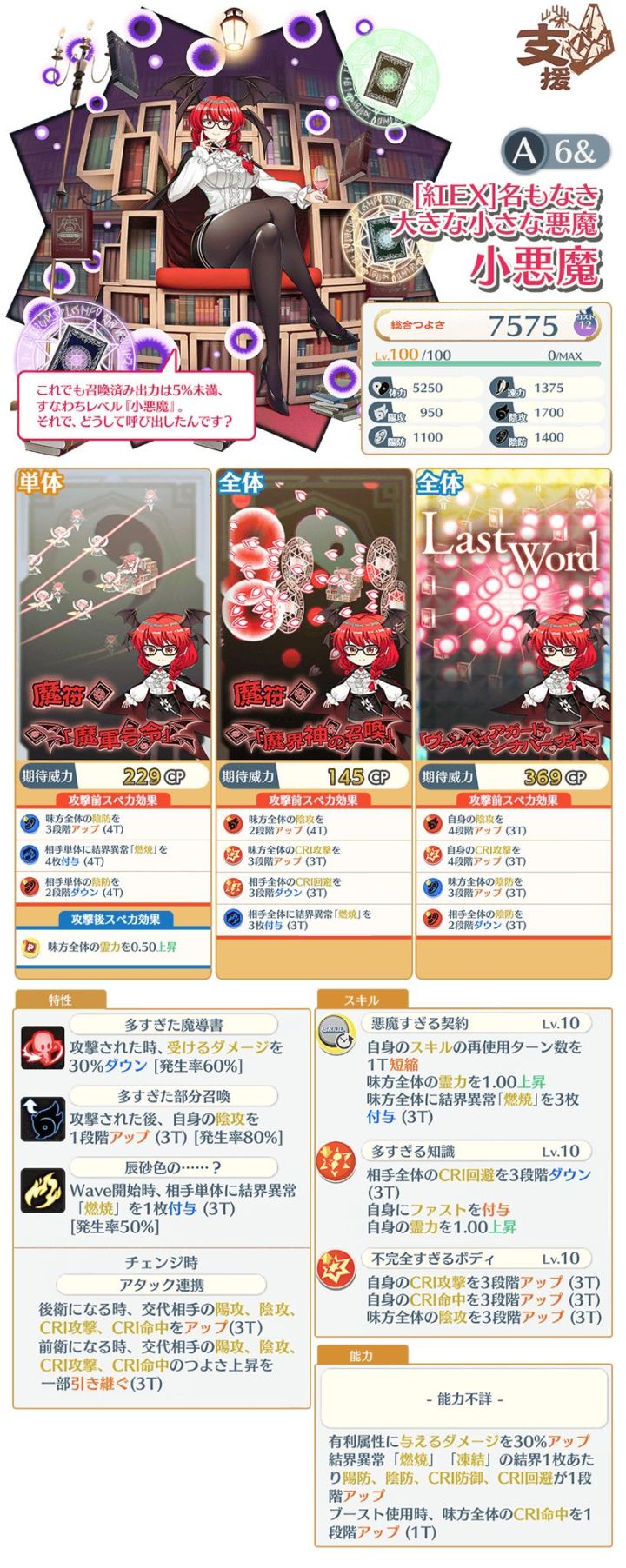 [红EX]小恶魔支援式ex限A6&世界线打阴,但是这面板全看补正是吧,速度给的很多,但是没有斩裂,纯纯是给你调速用的,技能,自身的技能cd缩短1T,想不出来占这个位置是想干嘛,1技能6cd,2技能5cd,3技能3cd,就单纯的把3技能的3cd减到2,在3t的作业中能开两次...剩下的拐都很常规,有利增伤30%单体小卡:特攻:16段,妖怪、人类、异变解决者、红魔馆、巫女、魔法使,3