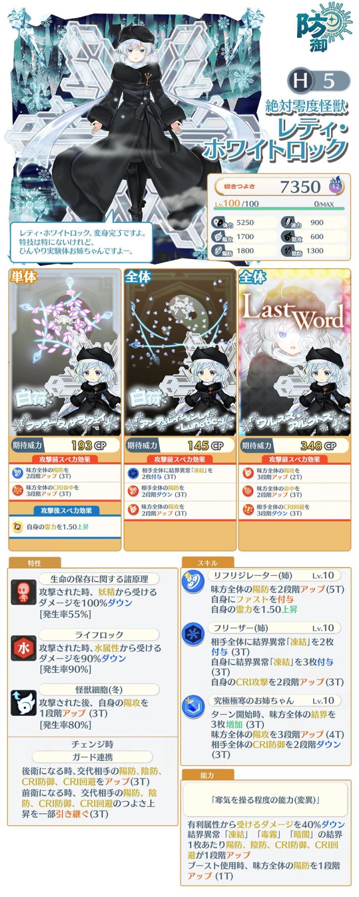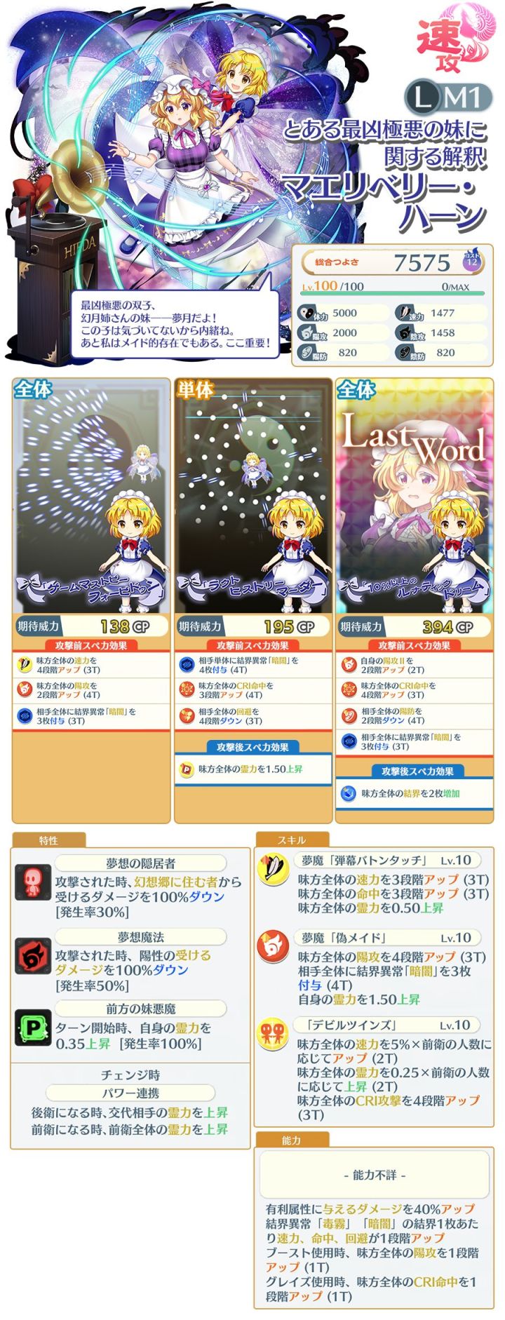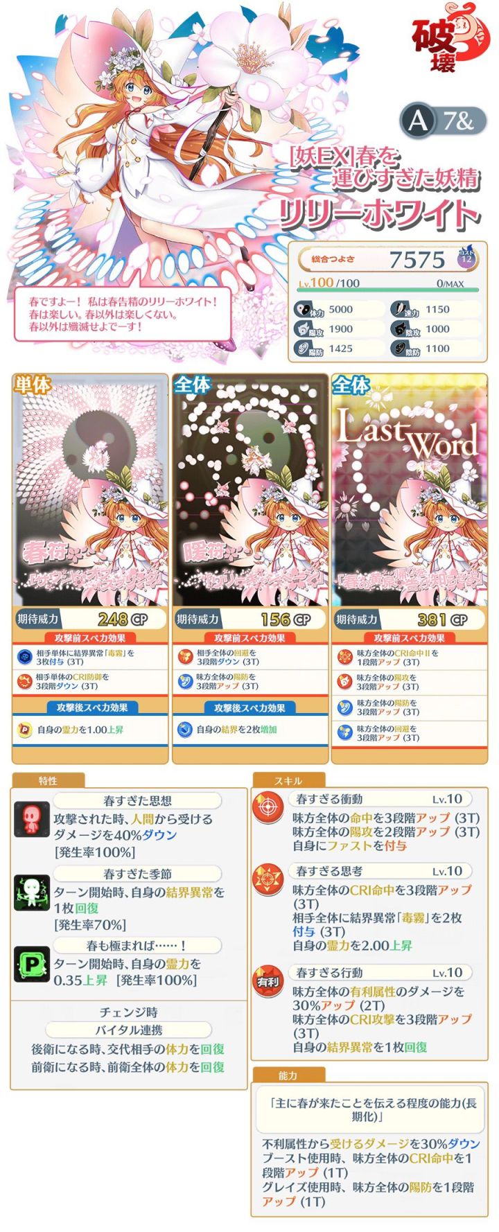 [妖EX]莉莉白A7&世界线破坏式EX限和大酱一样变成御姐了面板,居然给到了1900阳攻,技能全体有利增伤30%(2T),全体各种buff,感觉还挺正常的,没有结界激昂,反倒是开盾给阳防,单体小卡:特攻:人偶、巫女、魔法使、幽灵、女仆、妖怪、妖兽,硬质:80%、50%,单体3毒3p破盾,又一个通常弹角色,全体小卡:特攻:同上不上异常,3p破毒,技能也只给2,硬质:9