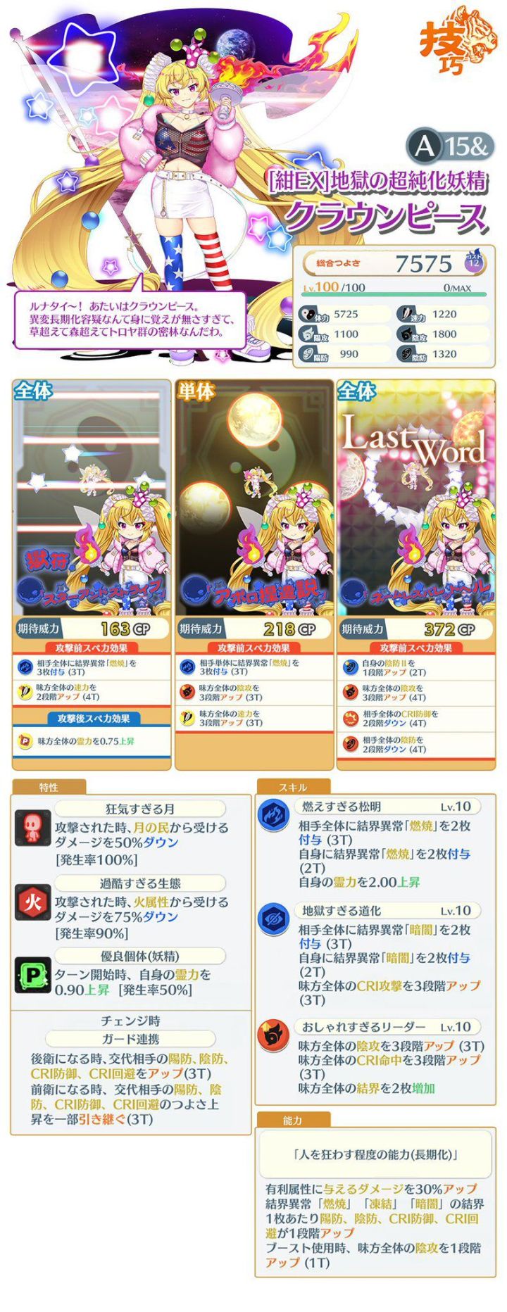 [文bEX]咲夜A9.4&世界线(不是这前缀怎么这么多)攻击式EX限打阴,又是个打斩裂的,面板感觉还行,符卡既EX封兽鵺之后又一个五全,技能,自身阴攻II2段,但是也是同样的问题阴攻I哪来?就lw给了3段其他几乎没有...其他的拐给的到也算可以,有利增伤35%,全体小卡1:特攻:1段:人类、兽、魔法使,46段:人类、兽、魔法使、红魔馆、幻想乡,5段:吸血鬼、恶魔、魔法使、红魔