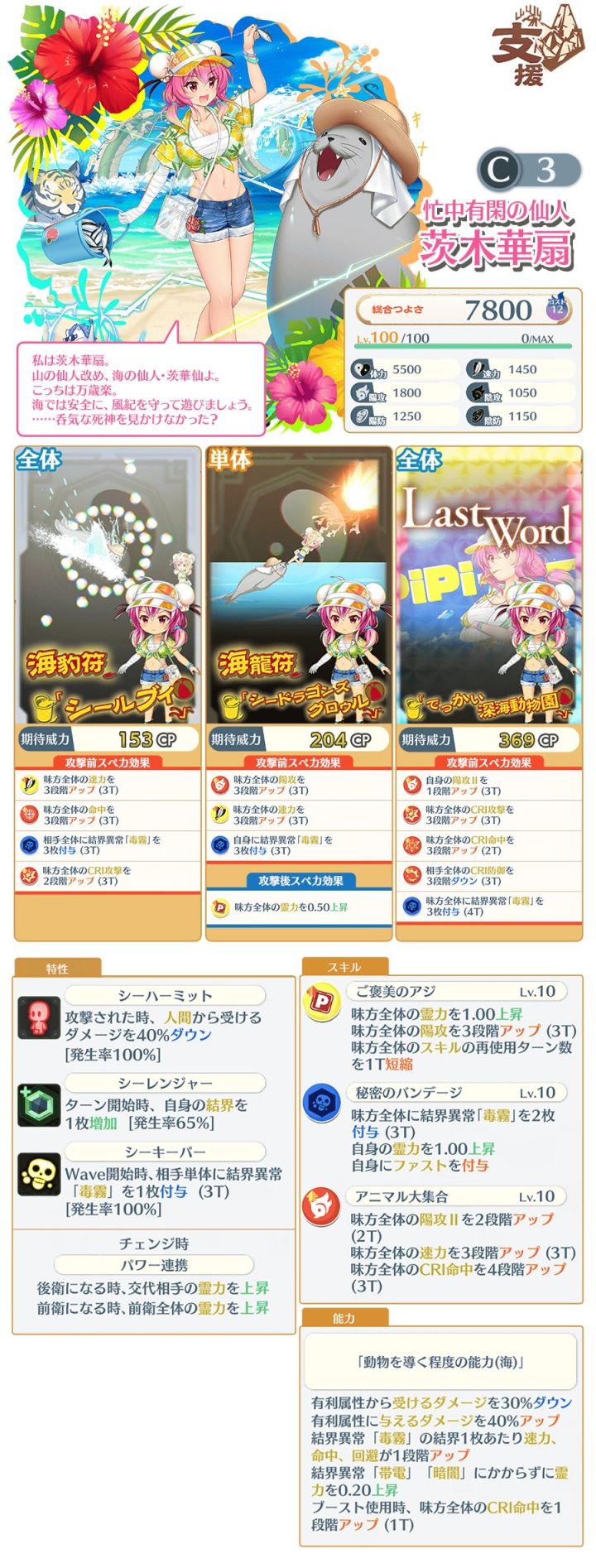 泳装华扇支援式贵限1800的阳攻在贵限中偏低,速力给了1450,打斩裂的话看补正了,技能模组算是可以的,缺点是cd实在过长(不过cd这玩意在复灵周回的时候4t和8tcd都是一样的)全体阳攻II2段,上一个有全体阳攻II的是没什么存在感的MV美玲,减技能cd其实在复灵周回的时候有用但不多,有利增伤给了40%,缺点是结界异常,不给阳攻..然后不免冰!此外自上结界能力比较少,而且开盾没有