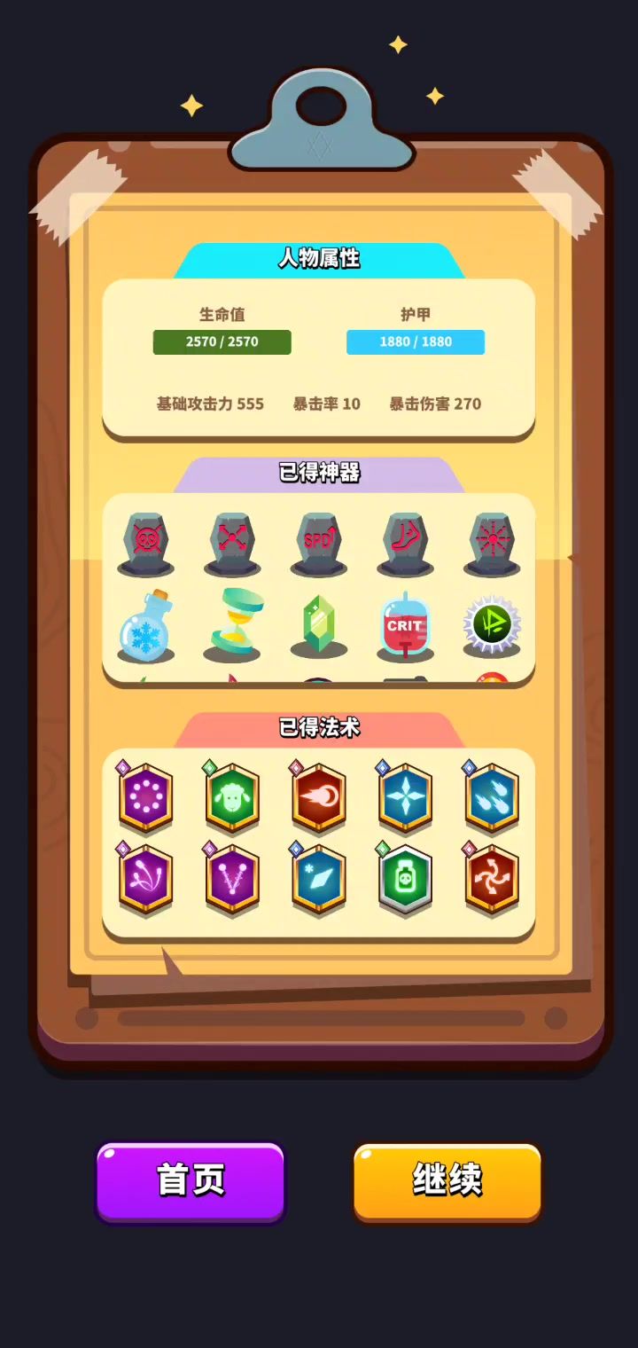 目前游戏时长大概20小时,最高232层。操作下饭,所以只分享一下打法思路。有不对的地方欢迎大佬在评论区指正。首先是法术。我个人比较喜欢的搭配正向箭、攻击力、暴击、连射、分裂、攻速、能量涌动是、弹射和墙壁反弹,剩下一个位置我个人比较喜欢带个闪避,渣操的时候可以赌脸。感觉带变羊应该也不错。然后是神器。尽早拿到锤子,金银斧,女王的折扇。这几件神器的后续收益极高,锤子保证后期不刮痧,斧子+扇子基本可以