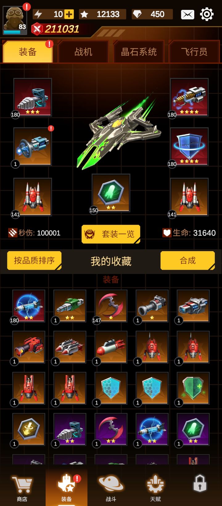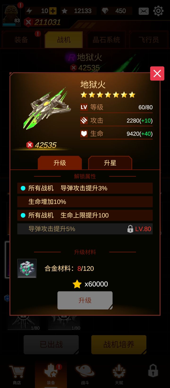 从1.7.20开始调整过后就不行了,战利品超少的,尤其是升级战机的合金材料。但是,从1.7.13开始,升级就受战机星级限制了,合金材料要多了也升不了多少级。 0星是20级,1星30级,6星战机才能升到80级。 手头上唯一满星的只有地狱火(没满级),满级的只有这个女妖(一星,旧版的升级不受限,但可以继承给新版用)。