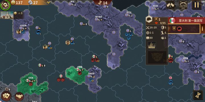集团军模式:跟征服模式还是不同的。集团军模式ai特别蠢,总是喜欢一个打一群,空耗科技点(就是那个齿轮,用了强行军又不走,浪费,难怪队友不给力,总是久攻不下。托管直接顺风变逆风)。没有战术配合,比如两个区域的集团军不能同时打同一个敌方区域(夹击)。更不要说什么包围了,永远是一个一个上,而征服模式不存在这种情况。