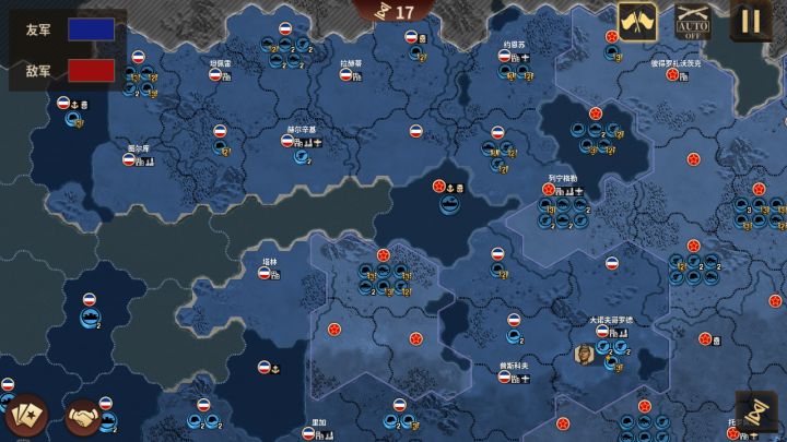 集团军模式的建议:当我方区域部队准备攻击敌方区域时,若被攻击区域附近区域有其他我方区域的部队,可以选择等待会战并对被攻击区域进行特殊明显标记,暂时不执行进攻命令。对特殊明显标记的地区,点击其标记,确认是否立即开始会战。是,则加载所有参与会战的区域和单位并对攻击区域进行攻击。无论战斗胜利与否,都会消去特殊明显标记。若战斗胜利,则所有参战部队占领该区域。回合结束时有区域单位数大于六,该区域获得拥挤标志,下回合该区域没有收益(金币和科技点),无法进行招募和补充及不能对其使用战术科技和国家科技(单位数小于等于六立即消去拥挤标志,取消其带来的负面影响,但损失的收益无法追回)。