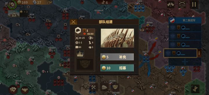 当然最初游戏大大也许就是以此来增加游戏难度,但作为一个非常懒散不喜欢啥事都要精力管理调整的人,我对这一点表示非常的不满,因为非常的痛苦,在那补充方面我一般不会选择一个回合将部队组建完成成一个完整战斗力,我一般会在一个回合在两个以上的城市招募队伍的分支,比如在有工厂的城市全部招募装甲炮兵单位,在城市单位全部招募士兵单位,而且我还不是一个回合全部招满,因为很贵。这样下个回合全部往某个地域移动,我就可以一回合弄出三四个成型集团军战斗力,而且成型的时候离战场已经不远了。。。