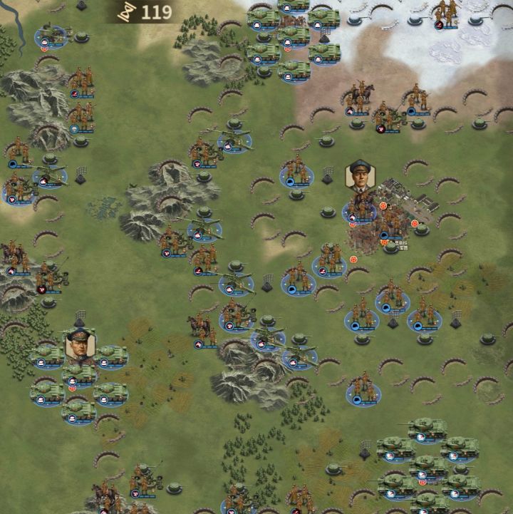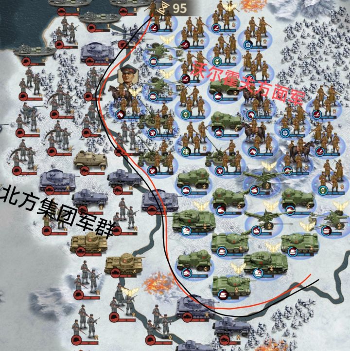 难得一见的满编 满精锐 满士气的敌军AI(甚至已经有四支步兵师连经验也满了)双方本着“敌不动我不动”的战术,对峙了10多个回合,哈哈哈……——————————————————————我记得历史上 图中这支强大的芬兰军队应该叫做 东南「卡累利阿集团军」。苏军这支则叫做「北方面军第7集团军」这俩在二战历史上打的有来有回,所以称作“旗鼓相当的对手”不过分吧#游戏安利#历史