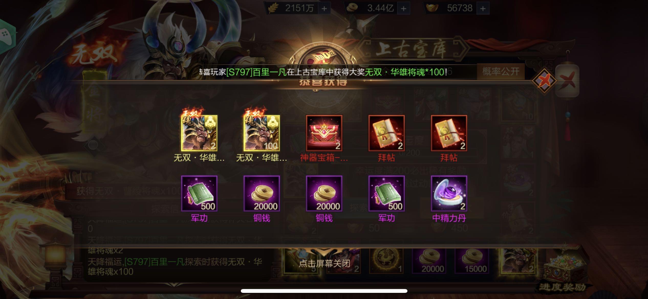 本周二宝库将迎来两名旧武将:无双蔡文姬(魏国谋士)以及无双张飞(蜀国枪兵)的返场,让我们一起期待吧!!!!!欧皇活动参与方式!!宝库中大奖的主公可在本帖下方回帖,回帖时请务必附上中大奖的截图以及自己的区服和角色名~(注:苹果用户暂时无法在帖子下带图回帖,可以单独在欧皇集中营发帖参与)我们将会在每周五进行登记,欧皇奖励会在登记后三个工作日内通过游戏邮件陆续发放。