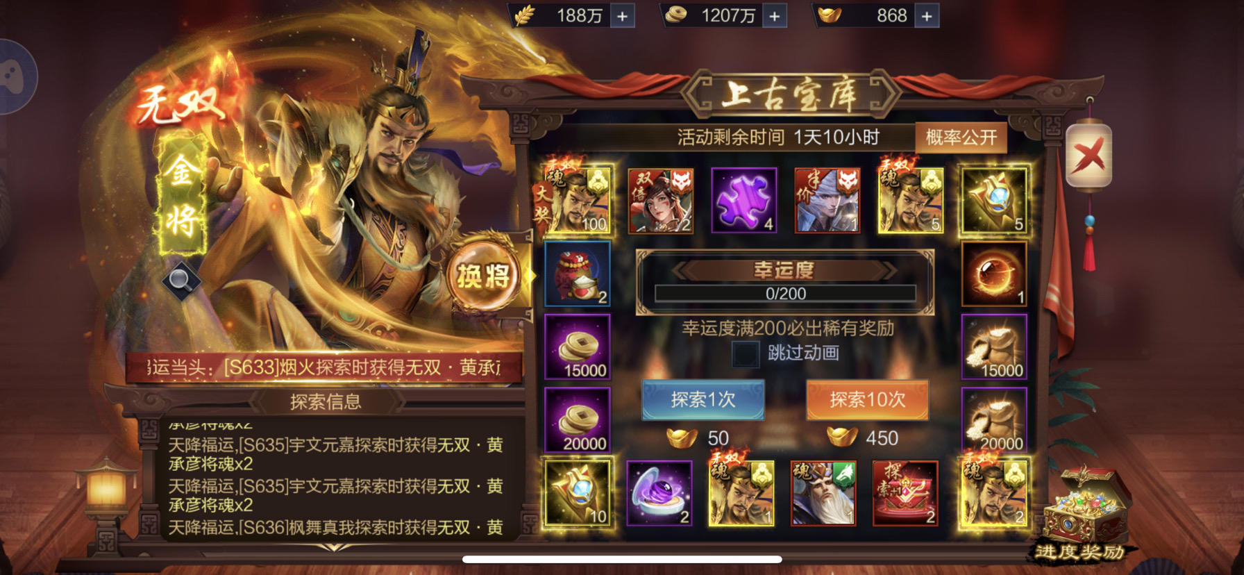 本周宝库将迎来大家翘首以盼的返场武将——无双马超,关键特性:暴击突进!同时还有无双董卓(肉盾输出盾兵)返场,大家的元宝都准备好了吗,希望主公们都能成为这一期的欧皇哦!!!欧皇活动参与方式!!宝库中大奖的主公可在本帖下方回帖,回帖时请务必附上中大奖的截图以及自己的区服和角色名~我们将会在每周五进行登记,欧皇奖励会在登记后三个工作日内通过邮件陆续发放。