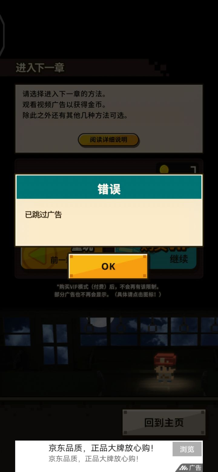 米12x,玩到第三章,闪退2次,看广告3次时间到后显示已跳过广告,vip买不起来。重复剧情时同一段对话要转场几次且不能一键跳过,真的没耐心再退回去找硬币闪退再找硬币了游戏也许是好游戏,但是真的没缘分🙈
