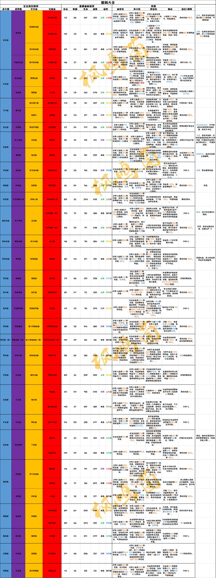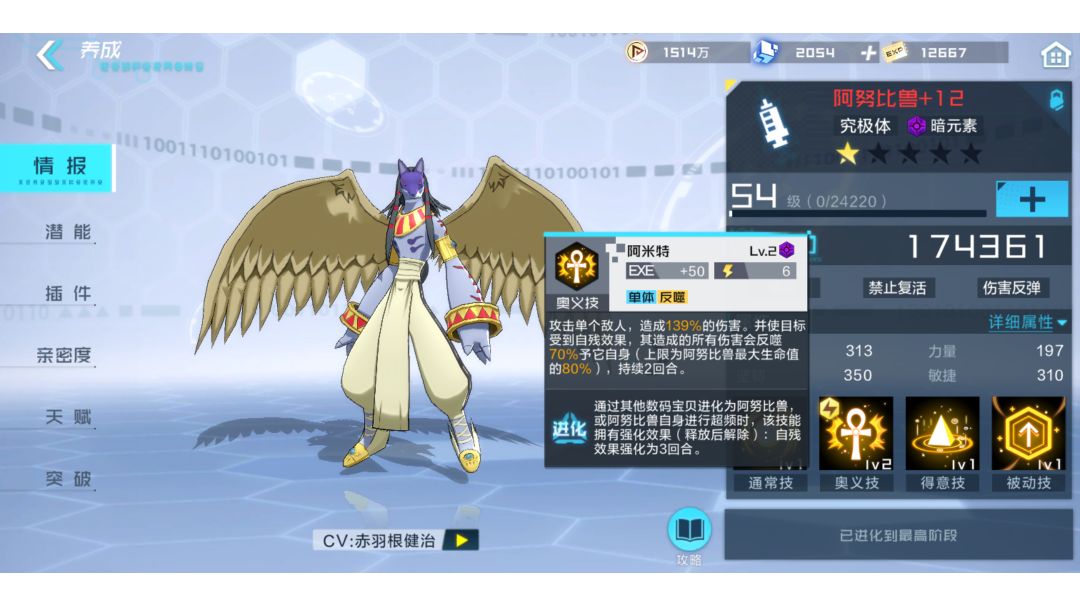 阿努比兽,作为一个容易被忽视的暗队辅助存在,很少人会养,但殊不知pvp中它能发挥出其他辅助难以发挥的作用。 奥义技:攻击单个敌人,造成一定伤害,并使目标受到自残效果,其造成的所有伤害会反噬50%攻击者自身(上限为阿努比兽最大生命值的80%)(突破至一星反噬70%,突破至五星反噬100%) 被动技:我方全体队友防御力+25%,敌方处于奥义技施加的自残效果状态下被击败,将永久无法被复活(突破至四星防御提升至35%) 得意技:攻击全部敌人并且75%概率使受击者异常状态(非控制类debuff)延长一回合(突破至三星概率提升至100%) 通常技:debuff类 主奥义技所以推荐突破一星或五星,插件方面堆血量即可,就是打和对面换血(活动插件:矫健,我认为简直般配)特别现版本人均炽天使和狐狸复活盛行,阿努比非常好用😜