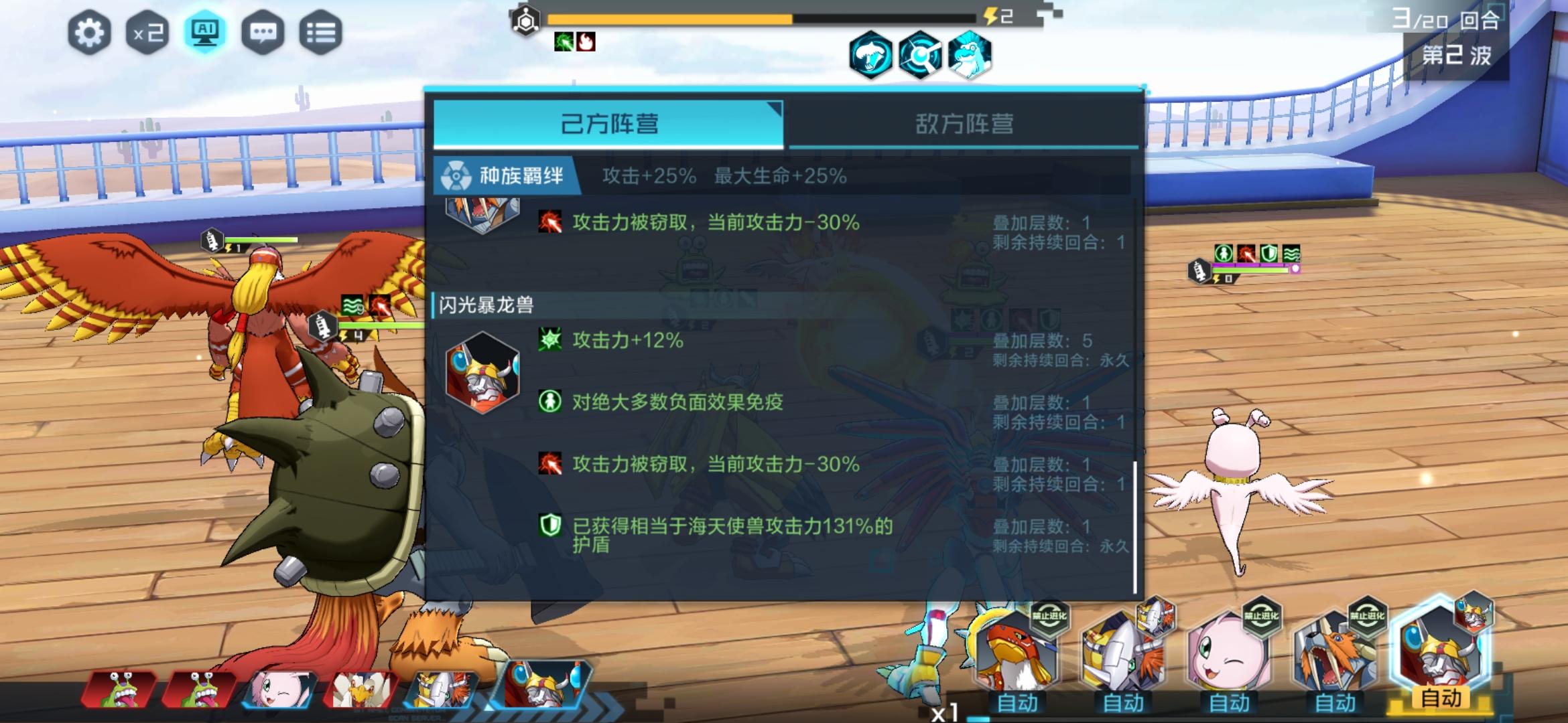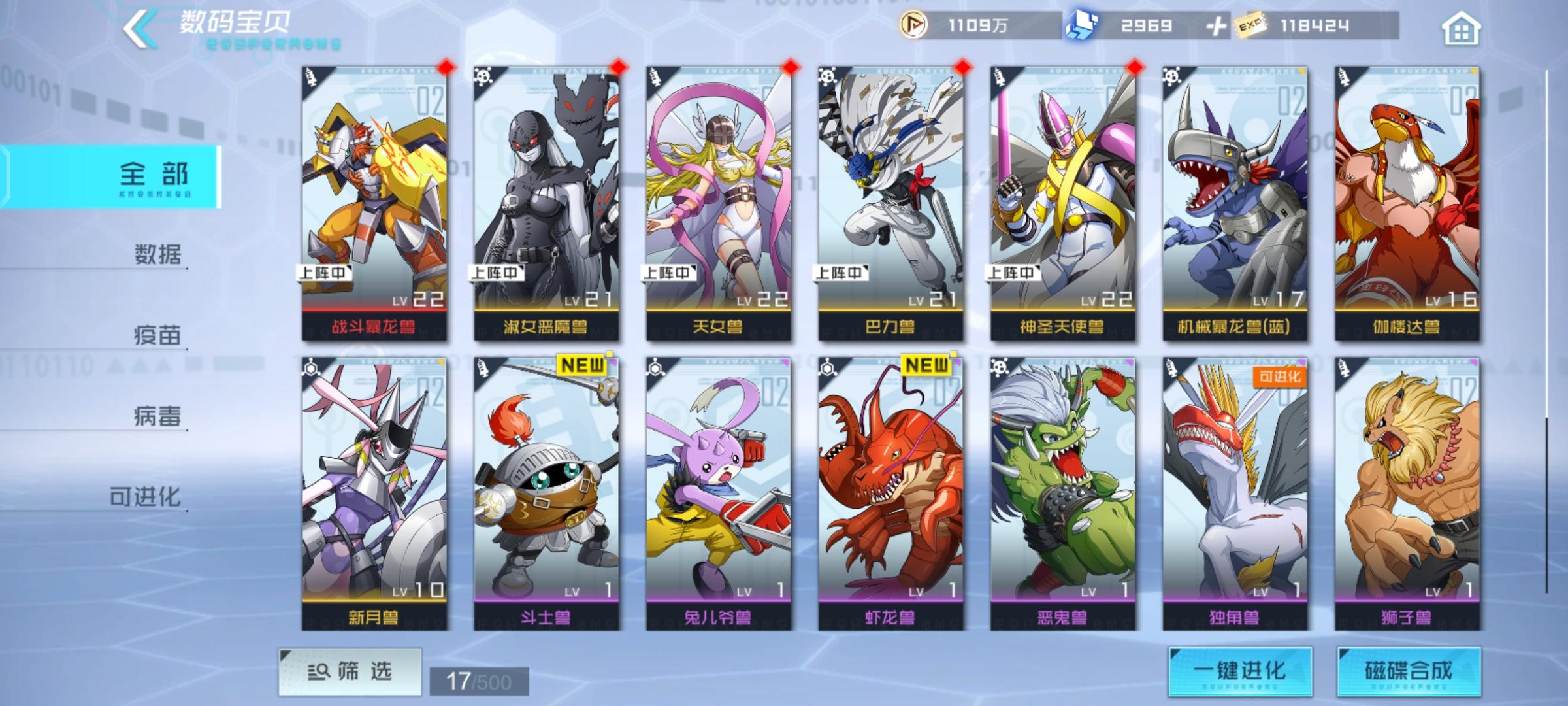 下面小编给大家介绍个数码宝贝比较常用的队伍搭配数码宝贝组合:战斗暴龙兽、闪光暴龙兽、凤凰兽、维京兽(十字兽或者尼普顿兽)、海天使这个数码宝贝组合很多关卡都很实用,五育苗组合承载了强大都属性加成,使这个队伍变的更强大,实用性更强,开局就是战斗暴龙兽魂石次日的海天使和第三天的凤凰,使很多玩家能更好的抽到魂石,组成战斗兽组合在天梯玩法中,这个队伍也不弱,输出回复以及控制都有,更好的能战胜对手