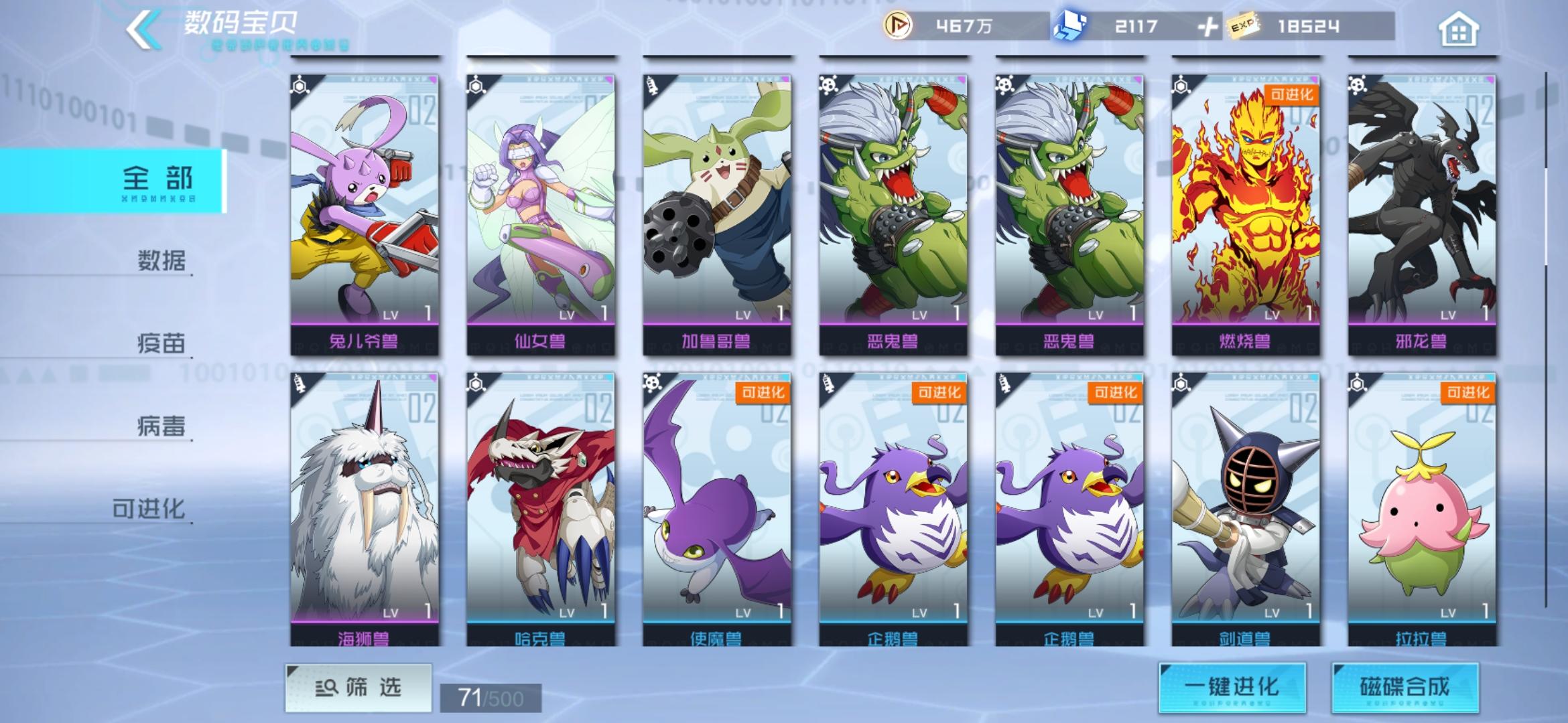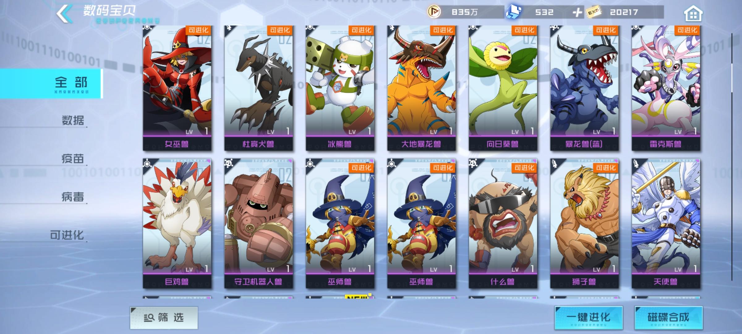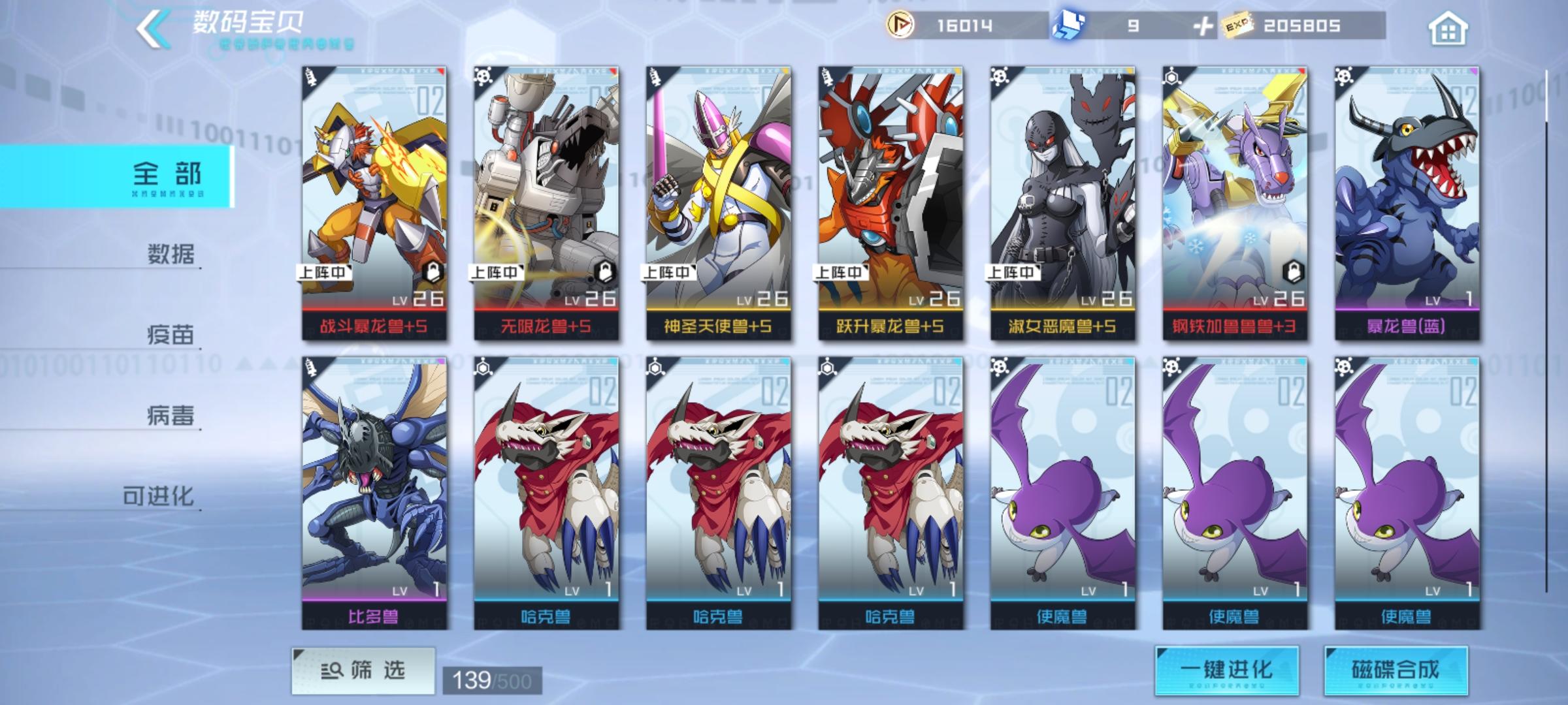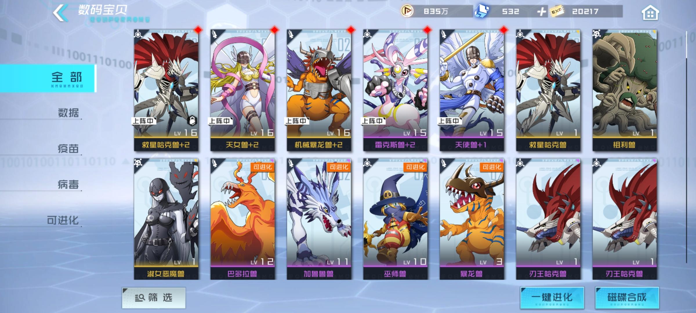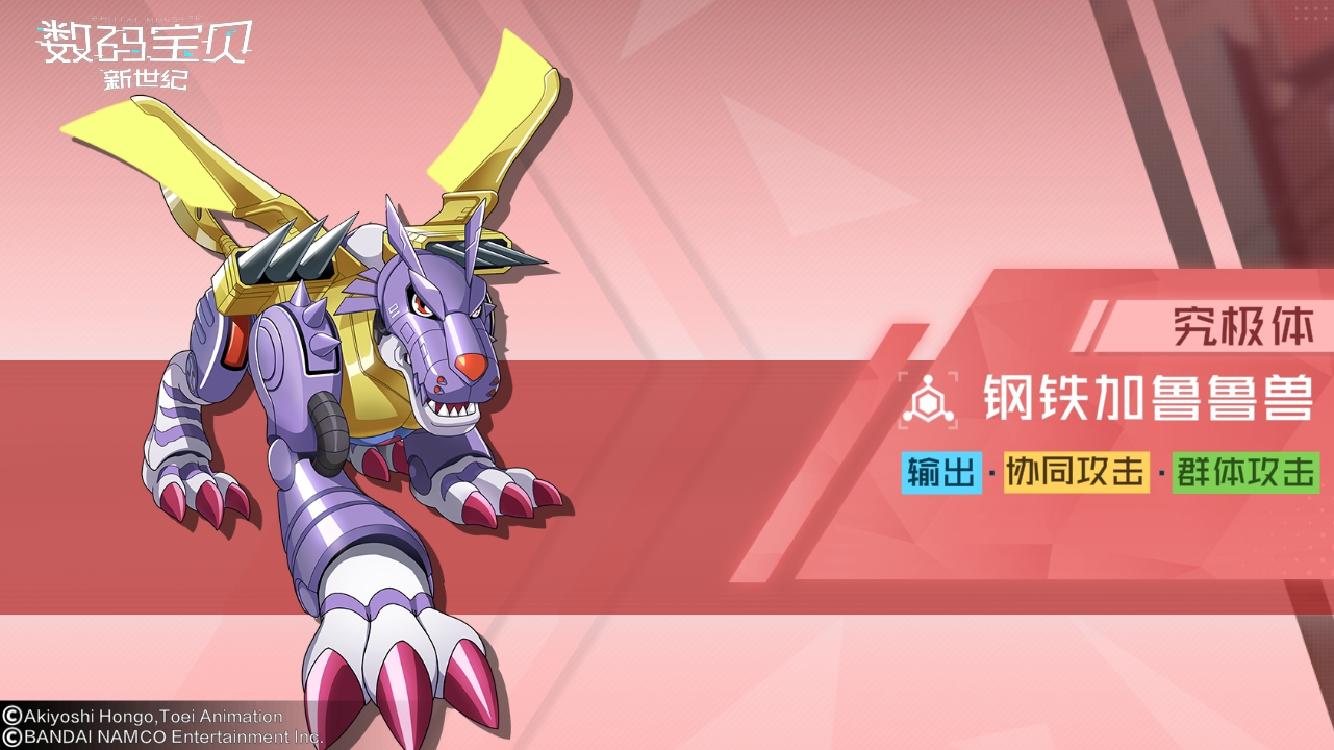 要想介绍数码宝贝的搭配,这里我要介绍下数码宝贝分的种族以及元素种类数码宝贝分为三个种族:疫苗、病毒以及数据,三个种族相互克制,克制关系是疫苗>病毒>数据>疫苗数码宝贝元分为火、木、土、水、风、雷、光、暗等元素下面拿我的阵容给大家介绍下如何搭配数码宝贝我的阵容里有战斗暴龙兽、尼普顿兽、钢铁加鲁鲁兽、海天使兽、凤凰兽 阵容特色:有输出,有治疗能力,又能控制很多关卡的治疗系BOSS回复血量以及