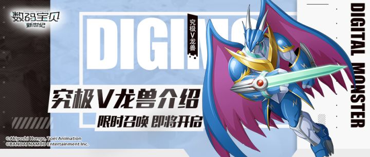 各位队长好啊,歌子来爆料新版本的最新资讯啦!12月16日,游戏内的数码宝贝图鉴将开放全新进化路线,实力强悍的究极V龙兽震撼来袭!今天,歌子将为大家带来游戏内V仔兽全新进化路线数码宝贝的背景资料,一起来看看吧~限时活动即将开启 究极V龙兽登场活动时间:12月17日05:00-12月20日04:59,还处于开服21天之内的区服不可见活动期间,究极体数码宝贝究极V龙兽的魂石,将限时加入召唤奖池
