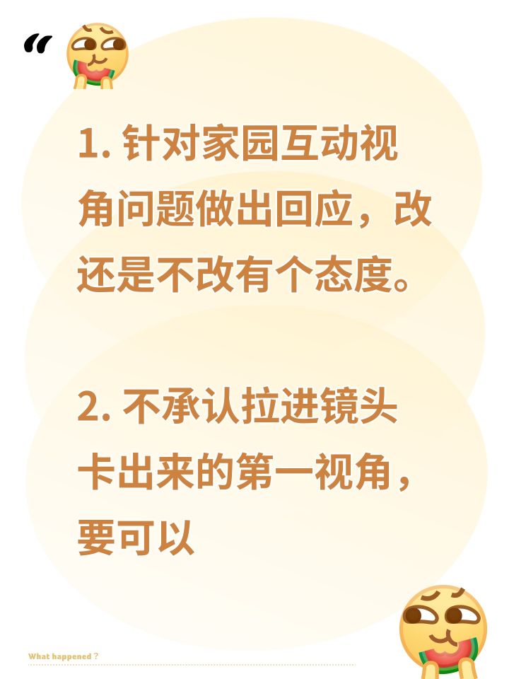 1. 针对家园互动视角问题做出回应,改还是不改有个态度。 2. 不承认拉进镜头卡出来的第一视角,要可以切换视角的按钮,并且互动都要做好良好适配,要视线高度适宜,不会出现无实物表演bug的、能和男主对视的真正的第一视角,现在有这个技术。 3. 拒绝将镜头聚焦于主控,主控只是玩家身份,拒绝转型为养成游戏,牢记你游是恋爱游戏。 4. 拒绝强调主控臀部线条,删掉主控隐私部位建模,完全规避恶意卡视角偷