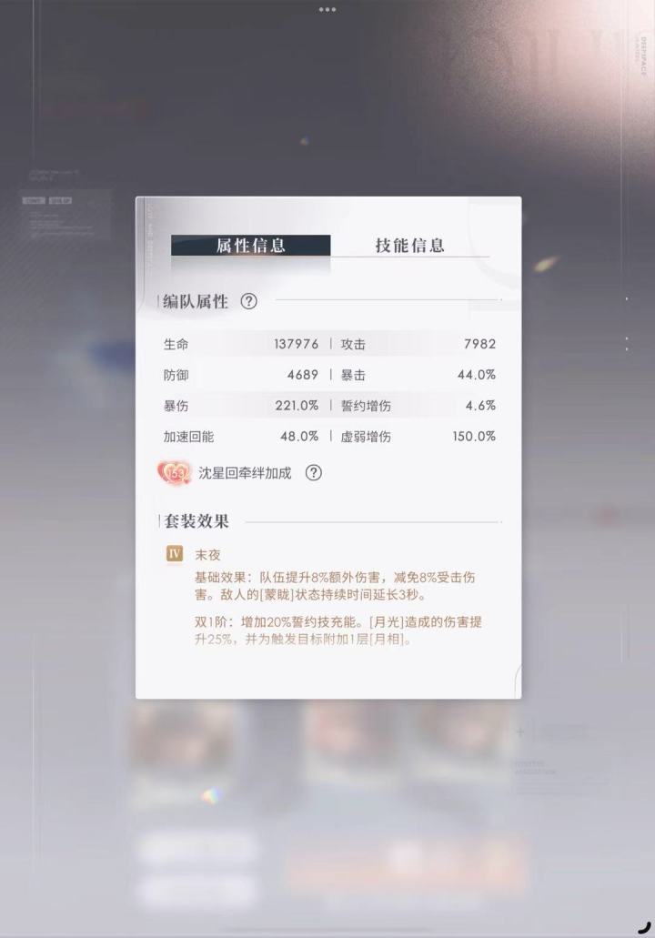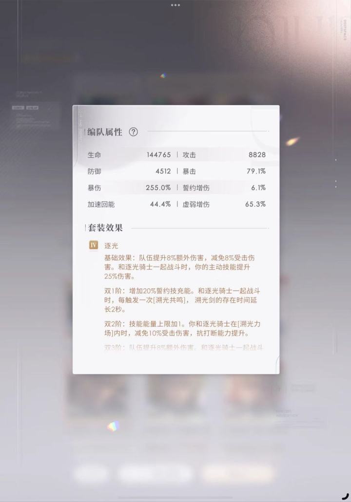 (不知道超话抽什么风所以在这边存个档)上满阶光猎对四谱不极限,虚增其实130%也够了但是努力减少上半凹度下逐光披皮光猎对三谱刷强协刷晕版(比较极限要凹)虽然我不懂为什么80暴击还要赌暴击可能这就是逐光卡的命运吧…是朋友的号,祝她后面三十关光猎爽玩#恋与深空 #开放轨道