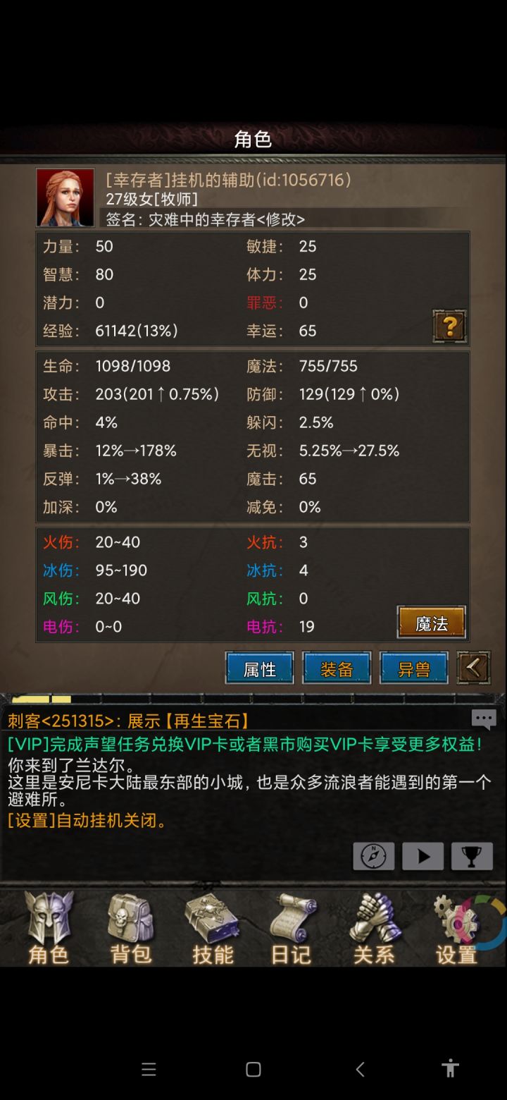 个人攻略看法萌新问的最多问题1.玩什么职业?什么职业强?答:4种职业都可以,萌新推荐战士牧师,不推荐刺客和法师 按职业强弱来说,战士牧师前期推图挂图方便简单,刺客法师后期强,因为这两个职业的技能不容易获取。2.该怎么加点呢?答:就这么说吧,35级前主加力量,有些装备需要智力+5,需要挂图可以适当加敏捷。攻击力和防御影响挂图稳定性。3.如何升级快答:首先跟着主线任务做,还有指引也要做有