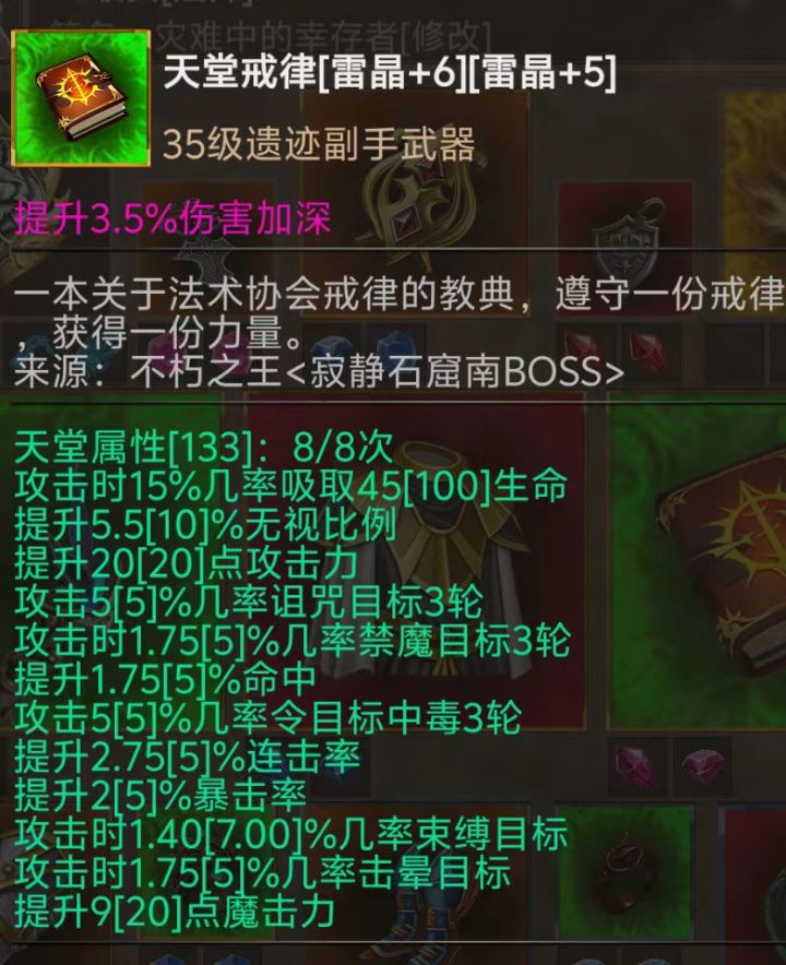 牧师 前期刷本速度较慢的职业但正因如此,牧师有一件所有职业都望尘莫及的遗迹装备:红色闪光,全游独一份7点的暴击,那么我们就来讨论一下它的凝炼,其实所有职业的主手凝炼都是千篇一律的:攻击,攻比,暴击,连击,爆伤,魔击这六条作为重要的是前四条,但对于牧师来说魔击也是很有必要的,因为牧师的复仇之光技能会根据魔击增加攻击,即使红色闪光的基础攻击面板较低,但是这依然不影响我们将它凝炼至传奇甚至神圣。遗迹