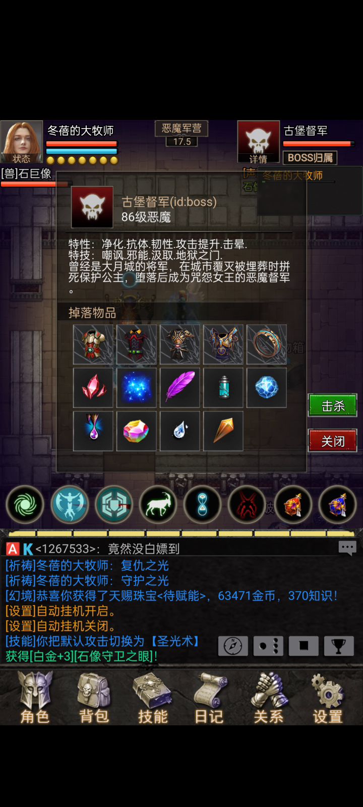 该副本作为旧版本最后一个副本,其难度不言而喻,其boss古堡督军拥有斩杀类技能(汲取,地狱之门)控制类技能(战士同款嘲讽)而且最可怕的是,该boss会使用技能联合形成斩杀链,汲取接地狱之门接嘲讽,这套技能下来,你最少扣2w血,让人防不胜防,所以打军营boss最低配置就是血量2w血,差不多带10百分比生命值的四件神圣防具,攻击类就显得随意,传奇或者神圣都可,毕竟和你的速度有关,看你自己