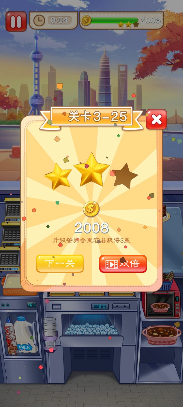 游戏时还剩八秒左右的时间,就差32金币完成本关3⭐目标,然后直接给2⭐结束游戏了是啥原因?客户数量限制嘛我前面应该都满足顾客要求了呀如图!它显示出来这个2⭐结束的时候上面都还有4秒,那可想是还要提前结束的,难道是我的网络问题嘛,求解决T﹏T之前关卡也发生过提前结束的问题,但是大多数要么是只剩五六秒,然后结束,要么是已经完成3⭐目标结束,这一个经历过剩余10秒,32金币,没客户了?T﹏T