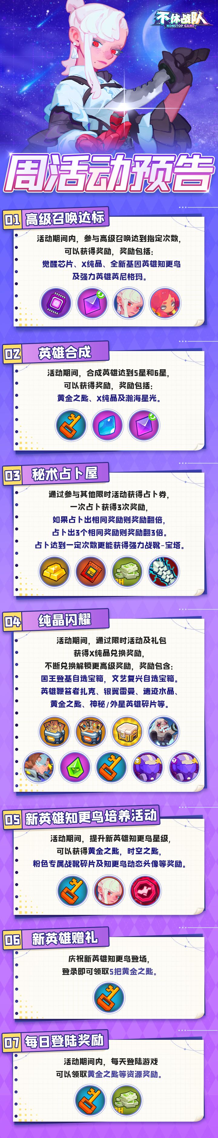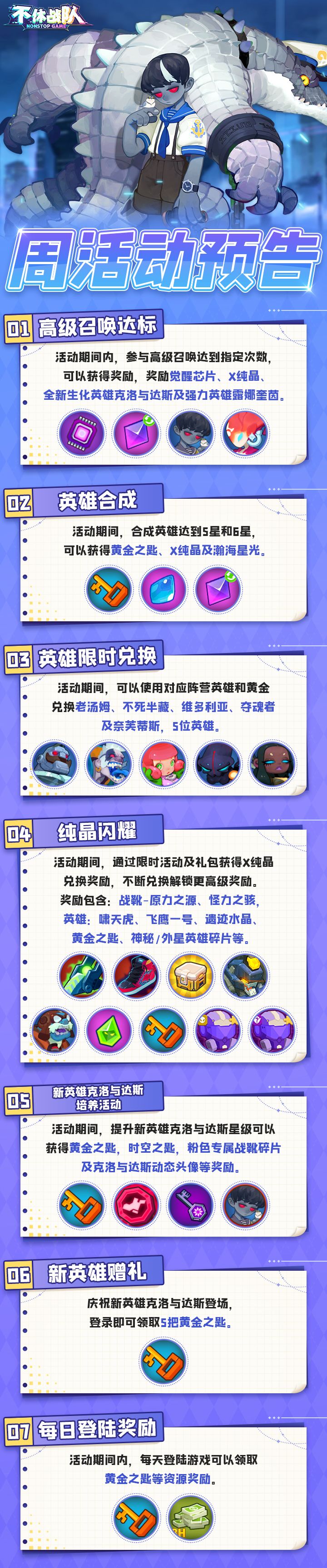 ①高级召唤达标:活动期间内,参与高级召唤达到指定次数,可以获得奖励,奖励觉醒芯片、X纯晶、全新生化英雄克洛与达斯及强力英雄露娜奎茵。②英雄合成:活动期间,合成英雄达到5星和6星,可以获得黄金之匙、X纯晶及瀚海星光。③英雄限时兑换:活动期间,可以使用对应阵营英雄和黄金兑换老汤姆、不死半藏、维多利亚、夺魂者及奈芙蒂斯,5位英雄④纯晶闪耀:活动期间,通过限时活动及礼包获得X纯晶兑换奖励,不断兑换解