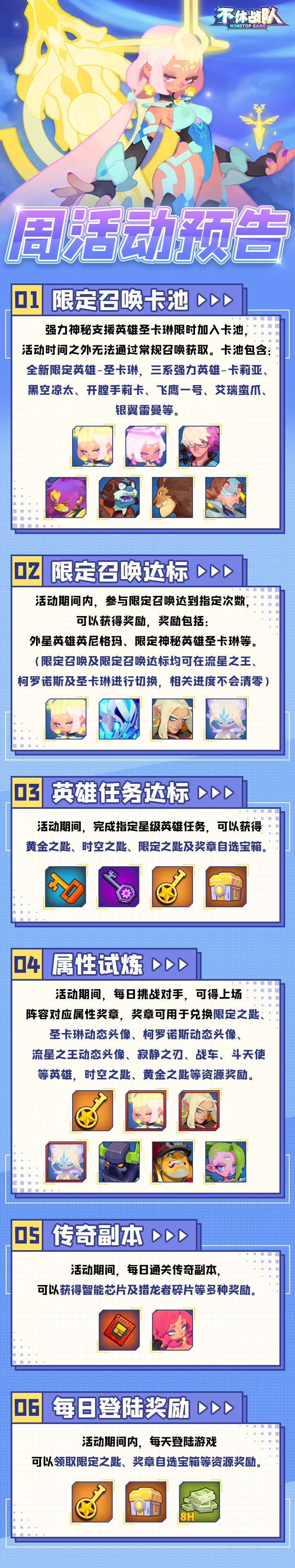 ①限定召唤卡池:强力神秘支援英雄圣卡琳限时加入卡池,活动时间之外无法通过常规召唤获取。卡池包含:限定英雄-圣卡琳,三系强力英雄-刺拳娜塔莎、黑空凉太、绯红丽莎、飞鹰一号、艾瑞蛮爪、魔球迭戈等。②限定召唤达标:活动期间内,参与限定召唤达到指定次数,可以获得奖励,奖励包括:神秘英雄布力扎尔德、限定神秘英雄圣卡琳等。(限定召唤及限定召唤达标均可在流星之王、柯罗诺斯及圣卡琳进行切换,相关进度不会清零)③