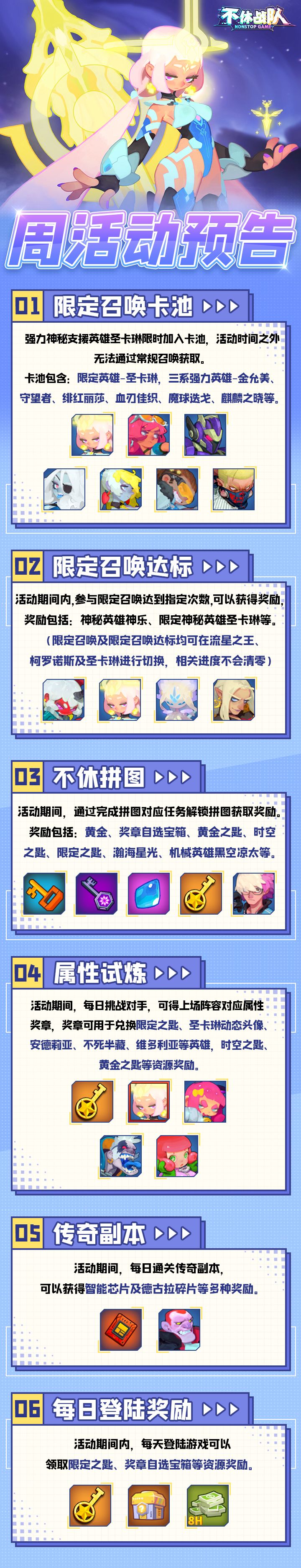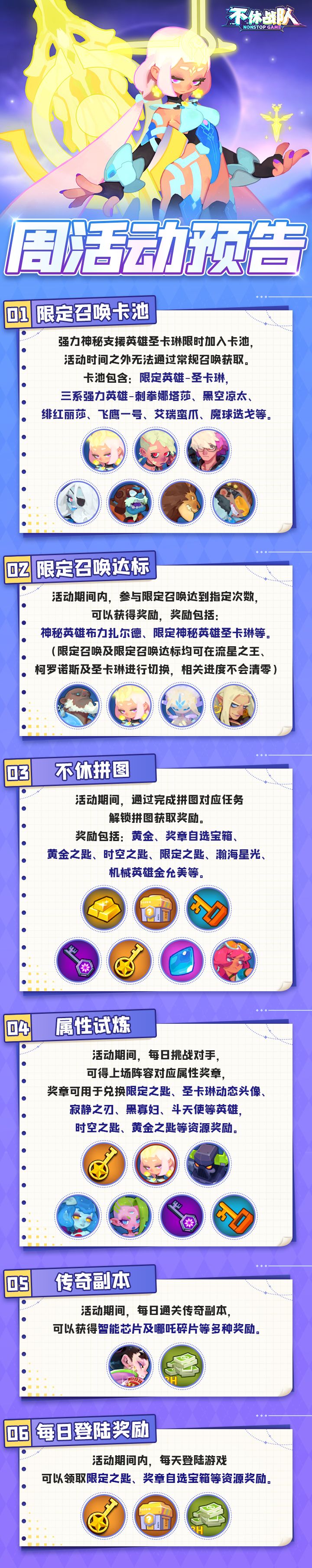 ①限定召唤卡池:强力神秘支援英雄圣卡琳限时加入卡池,活动时间之外无法通过常规召唤获取。卡池包含:限定英雄-圣卡琳,三系强力英雄-金允美、守望者、绯红丽莎、血刃佳织、魔球迭戈、麒麟之晓等。②限定召唤达标:活动期间内,参与限定召唤达到指定次数,可以获得奖励,奖励包括:神秘英雄神乐、限定神秘英雄圣卡琳等。(限定召唤及限定召唤达标均可在流星之王、柯罗诺斯及圣卡琳进行切换,相关进度不会清零)③不休拼图