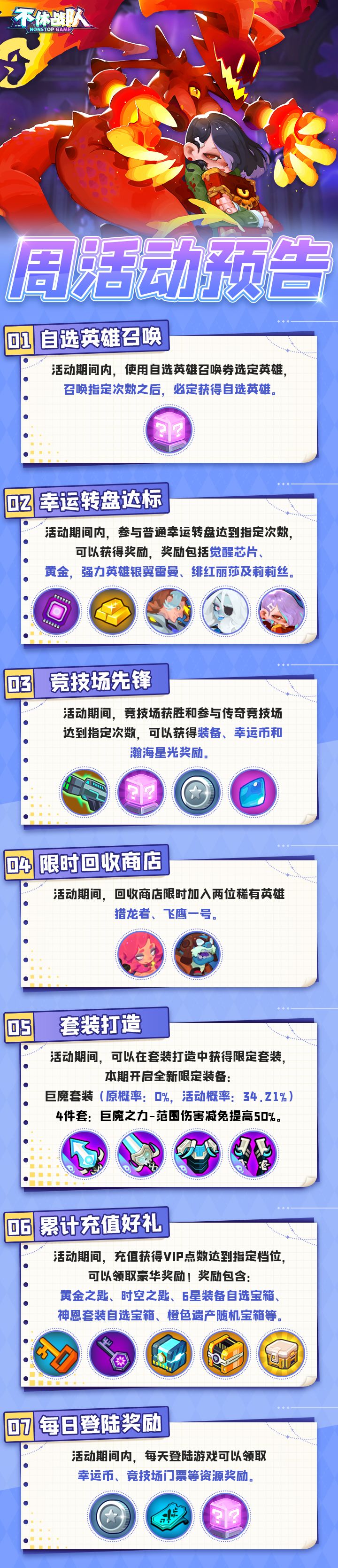 ①自选英雄召唤:活动期间内,使用自选英雄召唤券选定英雄,召唤指定次数之后,必定获得自选英雄。②幸运转盘达标:活动期间内,参与普通幸运转盘达到指定次数,可以获得奖励,奖励包括觉醒芯片、黄金,强力英雄银翼雷曼、绯红丽莎及莉莉丝③竞技场先锋:活动期间,竞技场获胜和参与传奇竞技场达到指定次数,可以获得装备、幸运币和瀚海星光奖励。④限时回收商店:活动期间,回收商店限时加入两位稀有英雄猎龙者、飞鹰一号。
