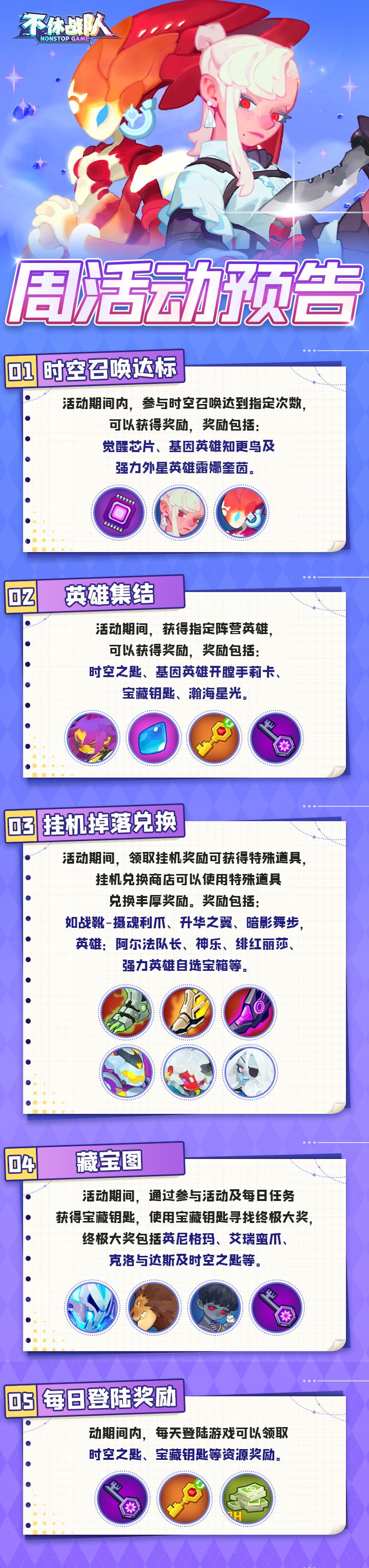 ①时空召唤达标:活动期间,参与时空召唤达到指定次数,可以获得奖励,奖励包括:觉醒芯片、基因英雄知更鸟及强力外星英雄露娜奎茵。②英雄集结:活动期间,获得指定阵营英雄,可以获得时空之匙、基因英雄开膛手莉卡、宝藏钥匙、瀚海星光。③挂机掉落兑换:活动期间,领取挂机奖励可获得特殊道具,挂机兑换商店可以使用特殊道具兑换丰厚奖励。奖励包含:战靴-摄魂利爪、升华之翼、暗影舞步,英雄:阿尔法队长、神乐、绯红丽莎