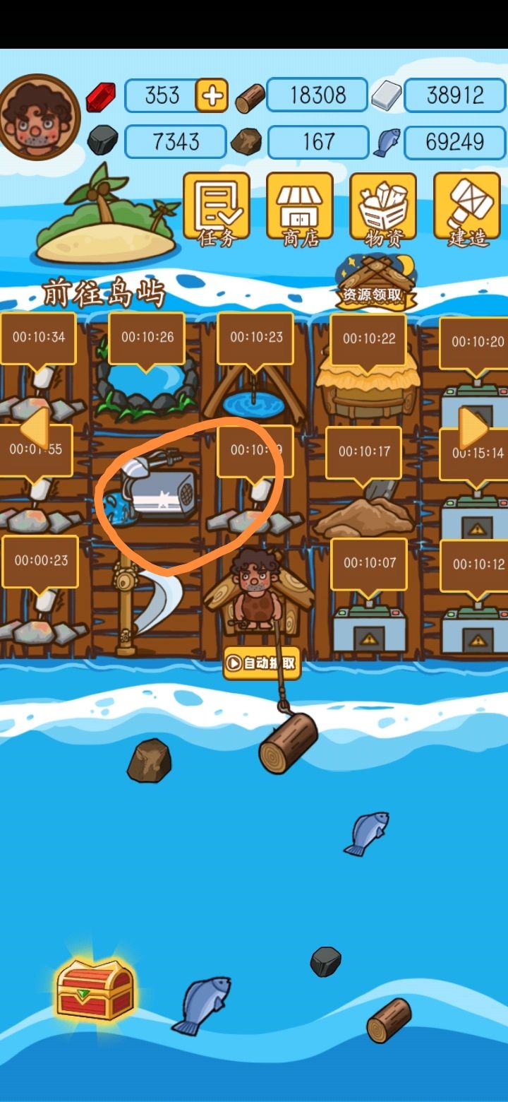 看到连个介绍和攻略的帖子都没有,想想我刚玩的时候束手无策的样子,我决定亲自上手写个介绍😂这是打开游戏后的页面,我这个是玩了几天的,比较佛系。进去后,是类似黄金矿工加木筏求生的玩法,用你手里的钩子去抓物品,然后建造,但在这两者之外又进行了创新,只想无聊的时候打发时间,不想肝的,可以玩玩看。我图片里画圈圈的那个,建议第一个建造,有了它之后,我们就可以去海岛了。点击左上角的海岛后,我们会出现下面这
