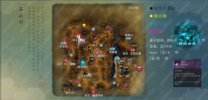 石头村地图,包含灵气点和宝箱~查询特殊物品掉落可CTRL+F输入关键词跳转石头村玄煞古僵击杀开启玄幽洞传送门长生洞门口打棺材开启棺中界传送门,进入首杀妖王获得20黄玉长生洞大宝箱掉落:混沌青莲仙人洞鱼王首杀掉落:混沌青莲黑熊谷击杀下方五只妖熊后开启玄天涯传送点玄天涯黑冥首杀掉落:混沌青莲迷津渡过客乡打掉星柱后开启星剑台传送门星剑台打掉噬心剑后拾取宝箱玄幽洞冰幽