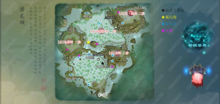 潜龙湖地图,包含灵气点和宝箱~查询特殊物品掉落可CTRL+F输入关键词跳转潜龙湖右上角定湖神柱完成之后掉落混沌青莲山大王旁边柱子可以进入封印之地,具体可以查看《》任务仙人遗府右上角洞穴为《》任务地图打罐子可以开启神秘地图的传送点,进入完成解密之后可以开启宝箱隐龙渊葬剑谷真·水帘洞水帘洞完成试炼可以开启真·水帘洞传送点boss击杀掉落:混沌青莲封印之地恶念首杀掉落:海·命