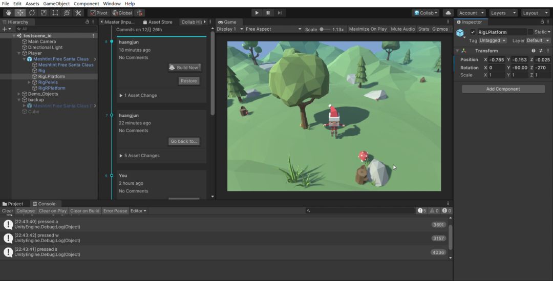 想做新玩法,工作日太忙,两人想了好几天没想到特别合适的方向。最后两天了,开unity拿免费资产来找找感觉,让圣诞老人来应个景确实有点灵感了,考虑pvp的变形玩法,先不管数据怎么交换,做了玩法再说。头次试用unity team云合作,好像网络同步、版本管理还不是很完善,队友调了一下输入方式,试试手感圣诞老人还是挺生猛的,空中缠斗或许也可以是个不错的玩法,人体战斗机 :D------------
