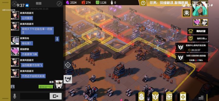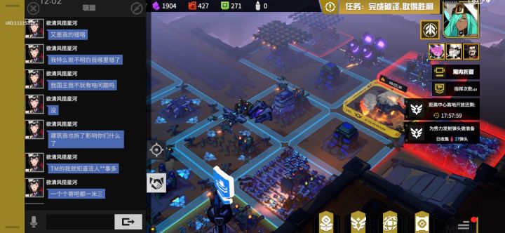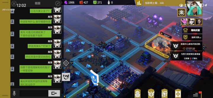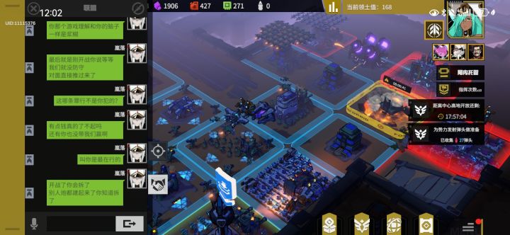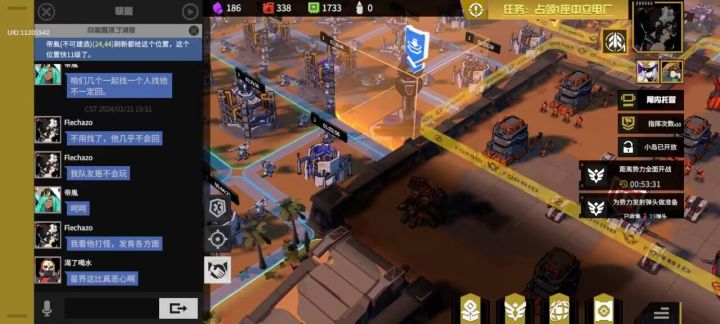 今天这把遇到了很离谱一个人 攻二的一把游戏还原一下事情经过吧:有个残局的进来说专门打残局当王的 买了很多万能卡 说带我们飞 我们刚开始的局势也不差(详细见图一)他是单王 也不指挥 也不做基建 一直吹自己以前当王多厉害多厉害 怎么一打八 唯一做的是把家里的炮位建雷达(如图二)也有人提出质疑 但他也没回应 大家也觉得无所谓 因为他说包赢 后面全面开战了 因为他是单王原因 弹头不够 然后被我这队取代了