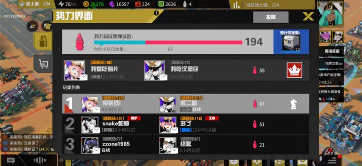这个“重返艾尔”是残局进来的,势力刚开战,显示他有两个号,240地加210的地,100架多的蜂鸟。