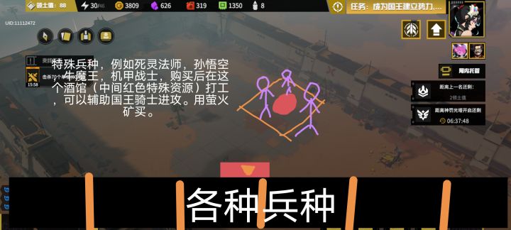 昨天梦到了很多游戏大更新挺有意思首先是界面右侧增加了新的功能菜单栏,包括可以给金矿升级,新的矿物升级,其它建筑升级建造等,国王功能,动画及广告等然后是挨着暗钢矿增加了新的矿物——萤火矿!紫色立体矿物。新矿物可以购买特殊资源例如特殊兵(强力英雄单位)最后是基地附近有一个特殊地块,中间有红色类似陨石砸过的裂隙痕迹,可以建造英雄酒馆(英雄基地)购买的单位会聚集于此但是有单位上线,聚集在此工作,获取